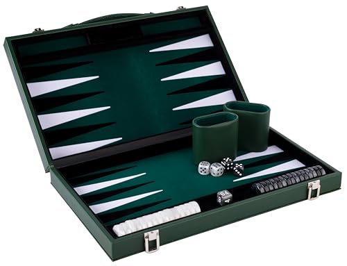 Engelhart – 250508 – Lyxigt Backgammon 15" (38 cm) – Grön Konstläderväska – Filtinsida – Pärlemobrickor + 2 Muggar – Klassiskt strategispel