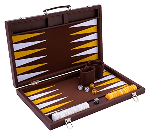 Engelhart – 250525 – Lyxigt Backgammon 18" (45,5 cm) – Brun Konstläderväska – Filtinsida – Pärlemobrickor & Tärningar – Strategispel för 2 Spelare