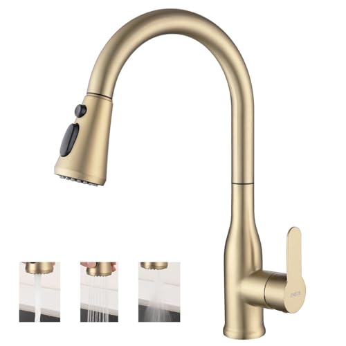 ONECE Köksblandare Guld Utdragbar Med 3 Sprayfunktioner, Vattenkran Kök i 304 Rostfritt Stål, 360° Vridbar Kökskran, Blandare Diskbänkskranar med Dusch, Engreppsblandare Kran