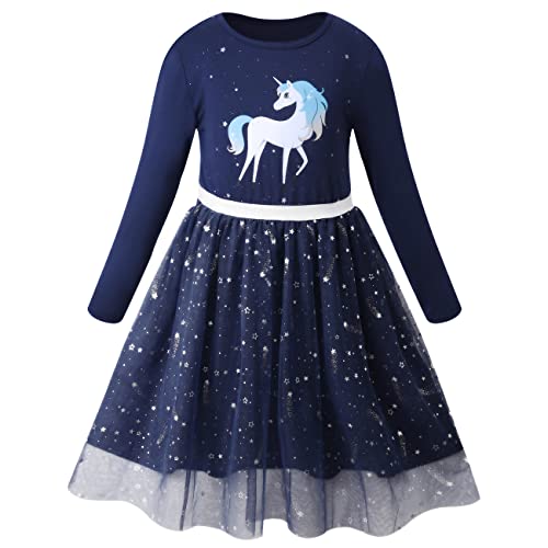 VASCHY Flickklänningar, 3–9 år, långärmad meshprinsessklänning, sött mönster, bomull, vardagsliv, för småbarn, barnkläder, Enhörning-asl03, 6-7 År