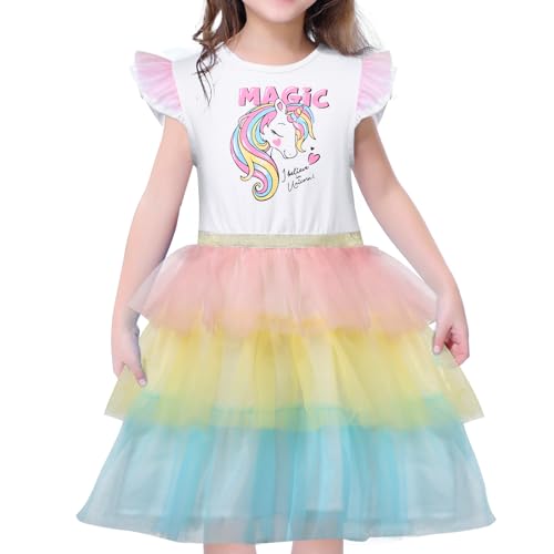 VASCHY Flickklänningar, 2–10 år, korta ärmar, mesh, prinsessklänning, sött mönster, bomull, vardagsliv, för småbarn, barnkläder, Ranibow enhörning-dx96, 8-9 år