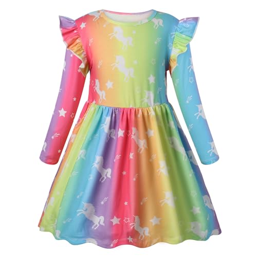 VASCHY Flickklänningar, 3–10 år korta långa ärmar tryck prinsesärmar klänning sött mönster bomull vardagsliv för småbarn barnkläder, Regnbåge enhörning – Dx52, 9-10 år