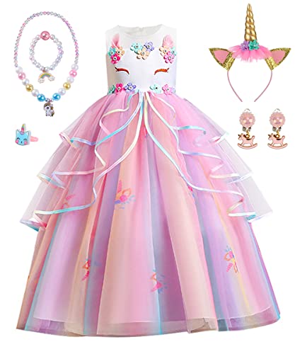 AOUVT 7 delar kjol med enhörningsbyst för barn, halsband med färgade pärlor, armband, trollstav, flickklänningar, festklänning med enhörning, prinsessklänning med enhörning, lämplig för flickor 3 till