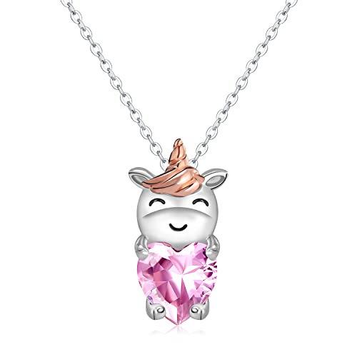 Qings Halsband för flickor prinsessa enhörning hänge hjärta halsband födelsestenar sterlingsilver 925 kostym kristall smycken för flickor barnbarn födelsedagspresent jul, Sterlingsilver