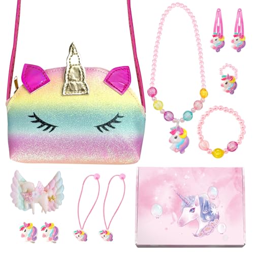 KIKVTER Enhörning presenter för flickor, flickor presenter 2 3 4 5 6 år, enhörning handväska smyckesset för flickor, enhörning halsband armband hårklämma smyckesset för flickor, barn smyckeset