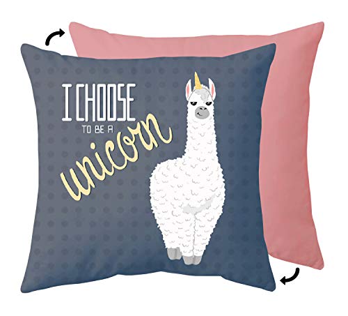 Kudde Lama – "I Choose to be a Unicorn", framsida med motiv, enfärgad baksida, ca 40 x 40 cm, blå/aprikos