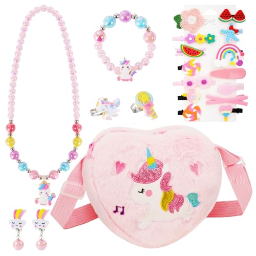 BBLTIFF Enhörning smycken barn flicka handväska, enhörningsväska med smyckeset, enhörning flicka leksak, barn flickor smycken 3–9 år, enhörningsväska med hårklämma, armband, halsband, ring