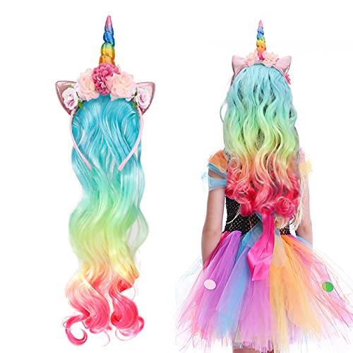 Hifot Flickor Peruk Enhörning Pannband, Halloween Karneval Flickor Tillbehör Enhörning Födelsedag Leksak
