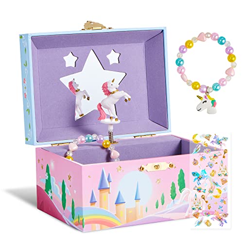 JOYIN Musikaliskt smyckeskrin flickor, enhörning presenter till flickor 4 5 6 7 år, rotation enhörning leksak för barn speldosa flickor gåva med spegel och enhörning armband klistermärken