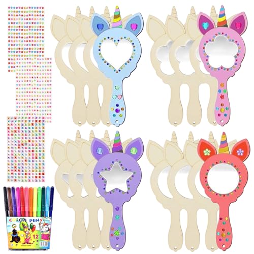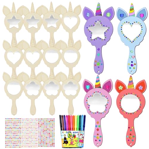 12 Stycken Enhörning Pyssel, Gör-Det-Själv Träspeglar Hantverk för Barn, Mini Trä Spegel, Barns Födelsedag Present Fest
