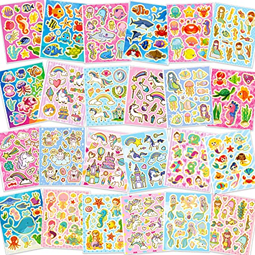HOWAF 330 glitterklistermärken för barn, flickor, pyssel, scrapbooking gör-det-själv-kort, regnbåge, enhörning, prinsessa, havsdjur, klistermärken, 24 ark flickor, klistermärken för papper,