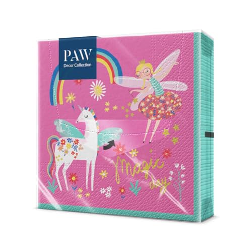 PAW – servetter 3 lager (33 x 33 cm) I 20 stycken I perfekt för fester, födelsedagar, fester I barnkalas bordsdekoration – färgglada pappersservetter med motiv – enhörning fe regnbåge I Fairy Unicorn