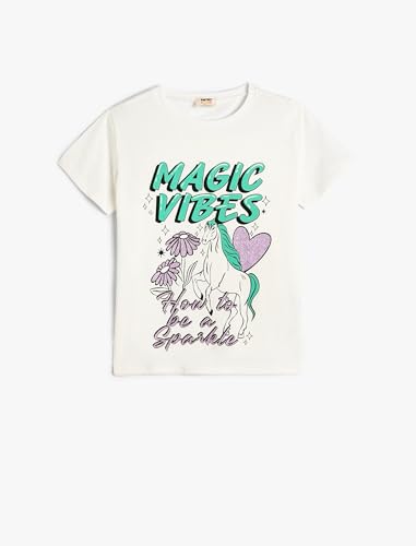 Koton Girls's Crew Neck Short Sleeve Unicorn Tryckt T-shirt, Ecru (010), 7-8 År
