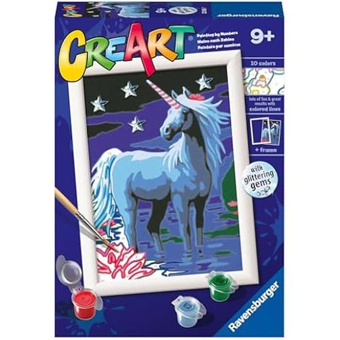 Ravensburger - CreArt Serie E Classic: magisk enhörning, målar-kit enligt nummer, innehåller en förtryckt tavla, en