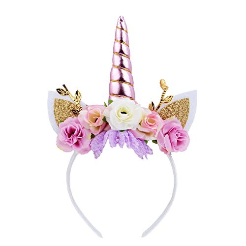 Nishine enhörningshorn blommigt pannband glitteröron ponny pannband tiara för flickor fest födelsedag cosplay (rosa och elfenben)