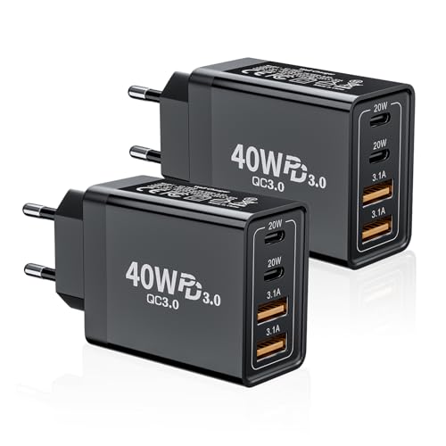 2-Pack USB C-Laddare, 40W 4-Ports Multiladdare med USB-C och USB-A, Snabbladdare Strömförsörjning PD 3.0 Strömadapterkontakt för Phone 16/15/14/13/12/11/Pro Max/XS/XR/8/7/iPad/Samsung/Surfplatta