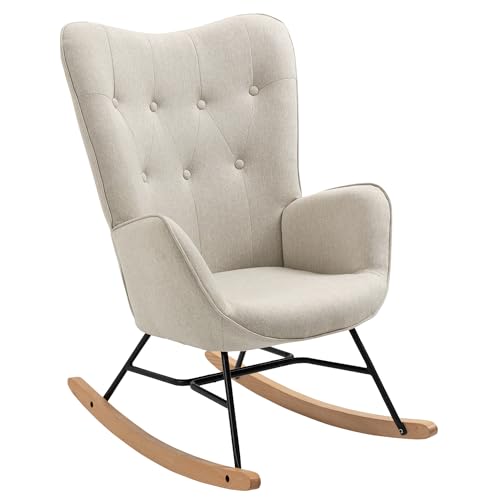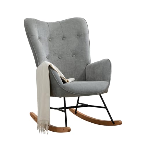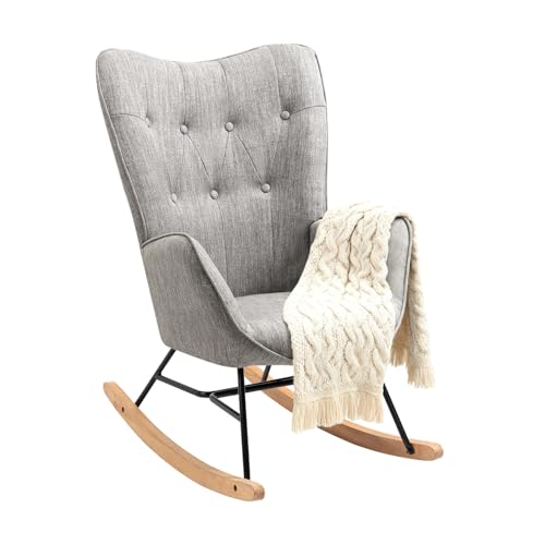 MEUBLE COSY Gungstol, gungstol, relaxstol, fåtölj med armstöd och vadderad sits för vardagsrum, sovrum, metallram och träbas, tyg, grå, trä, 66 x 84 x 97 cm