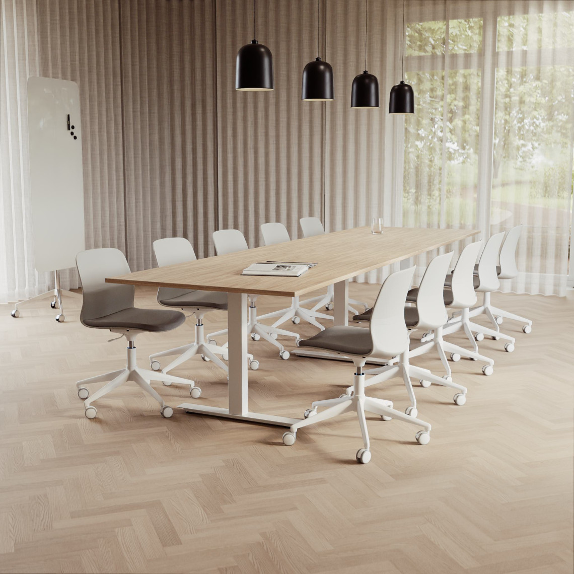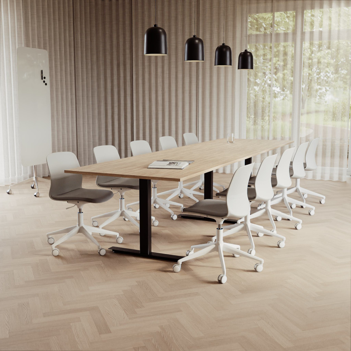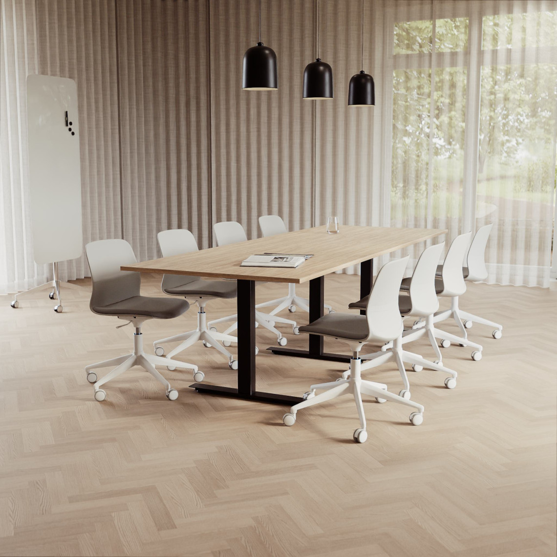 Konferensgrupp Modul + Ergo 285, Storlek 10 platser (360 cm), Bordsskiva Ek, Underrede Vit, Stol Svart