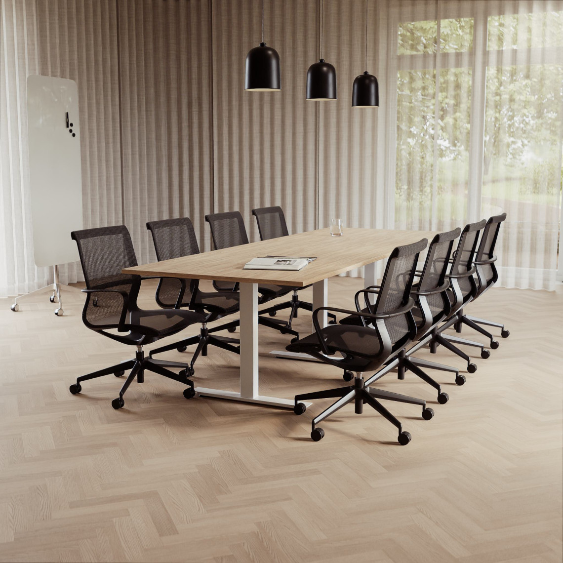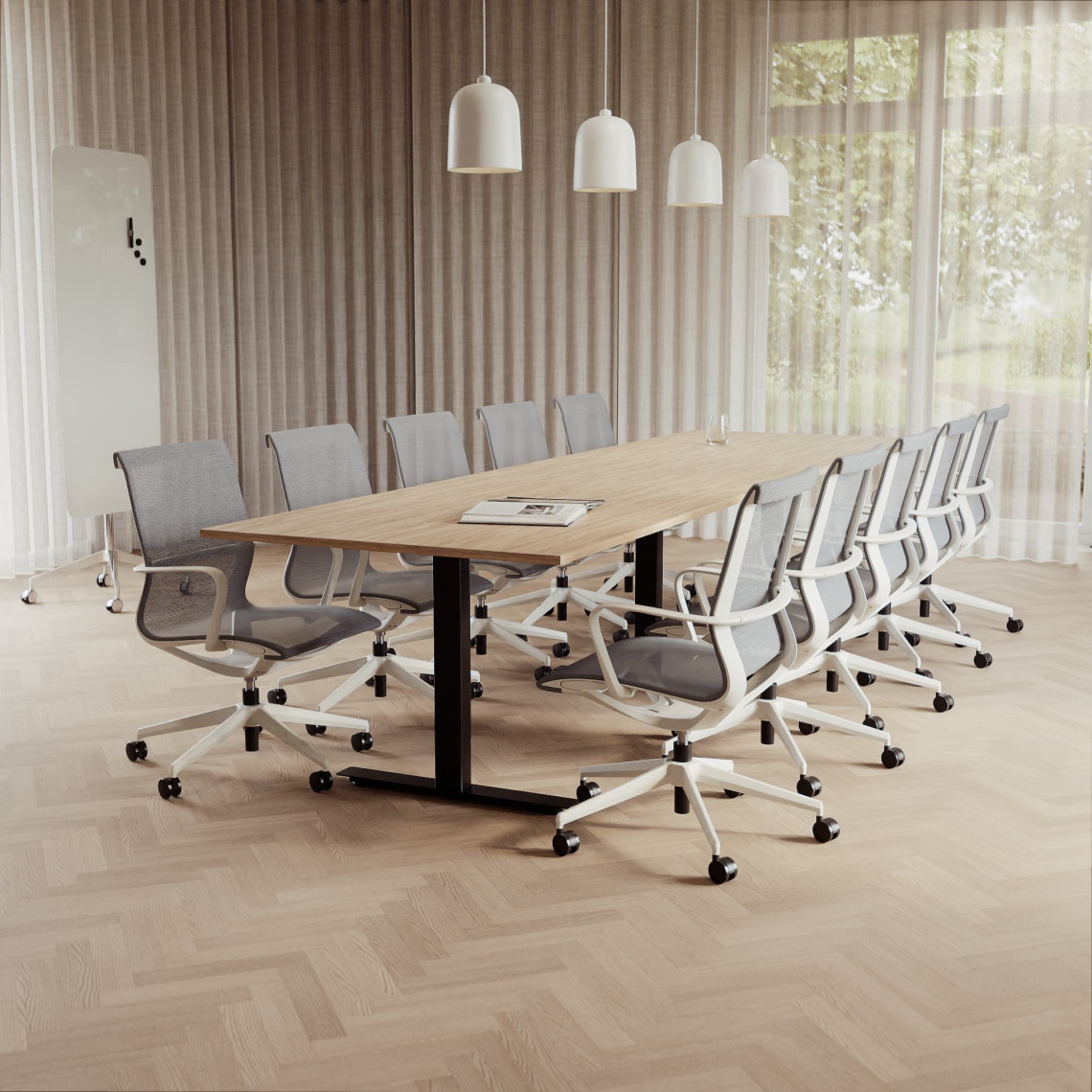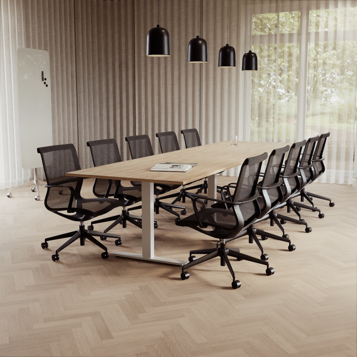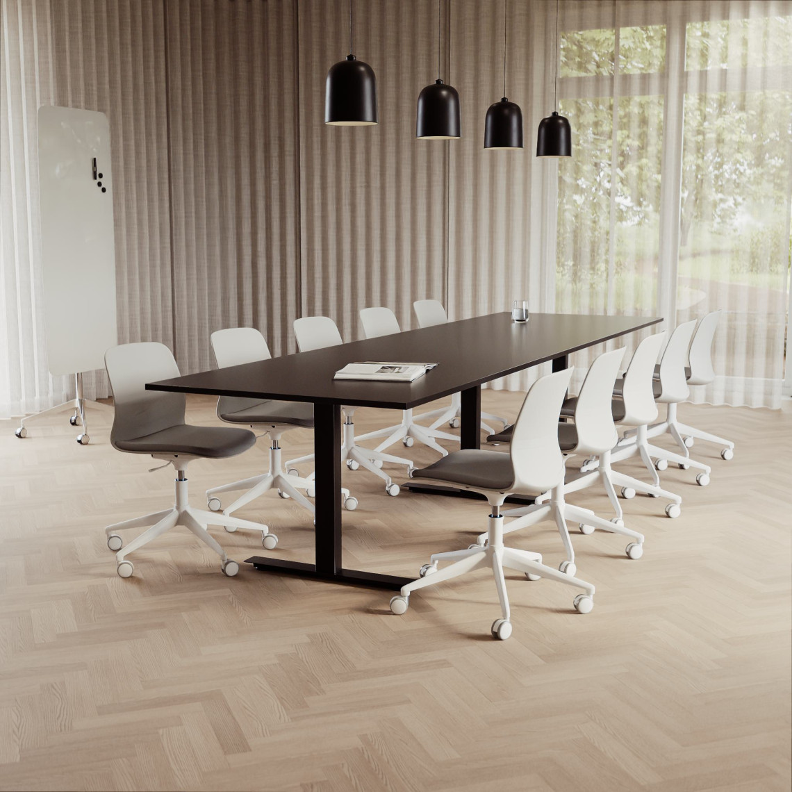 Konferensgrupp Modul + Ergo 285, Storlek 10 platser (360 cm), Bordsskiva Ek, Underrede Vit, Stol Svart