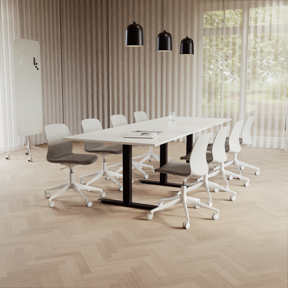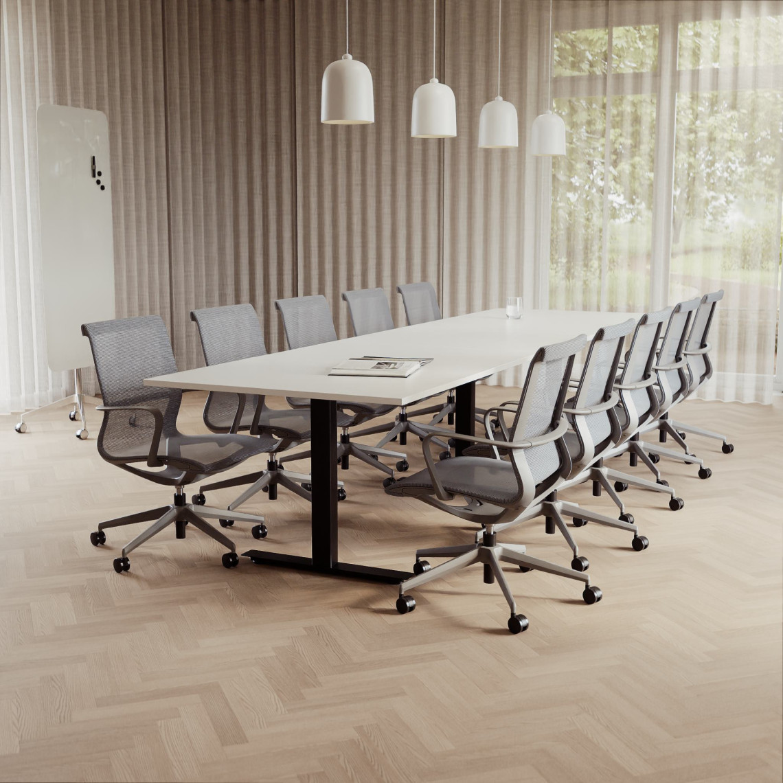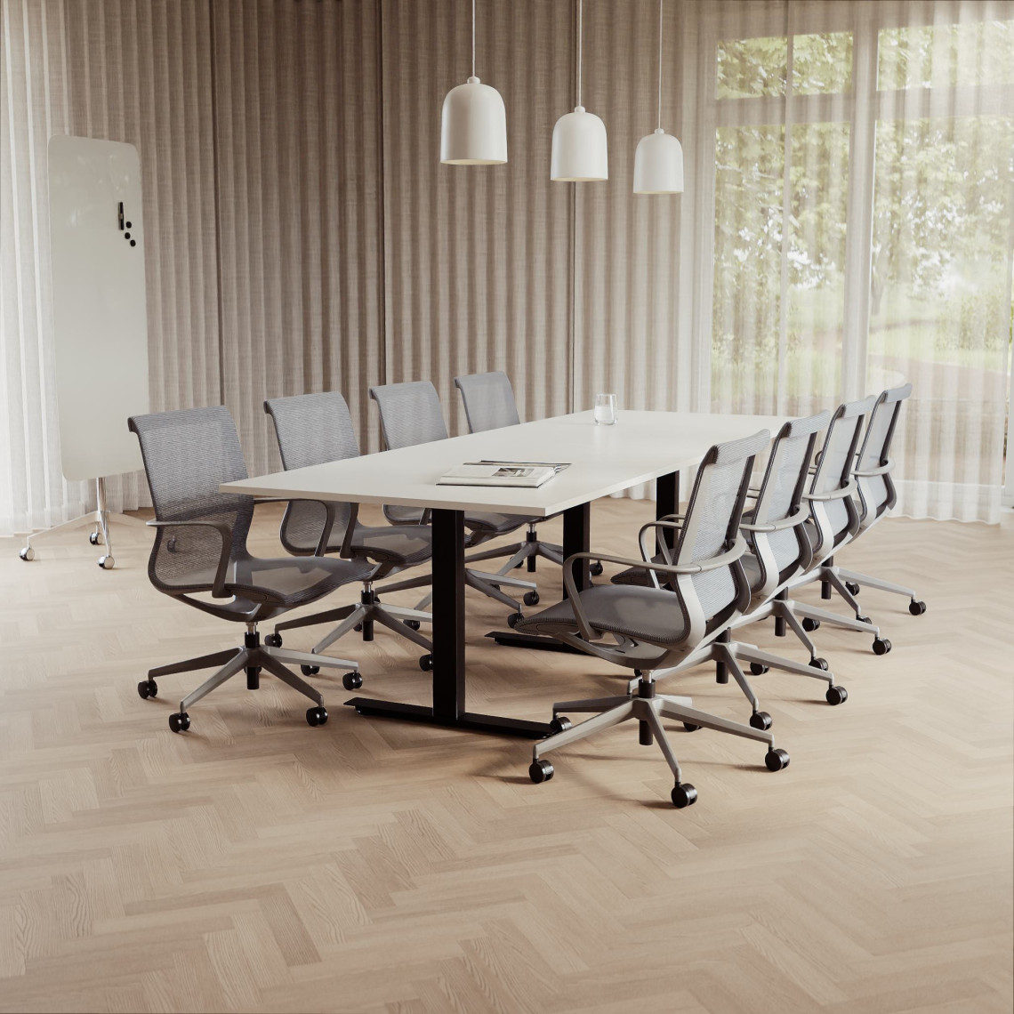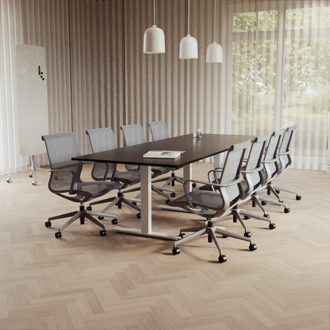 Konferensgrupp Modul + Ergo 285, Storlek 10 platser (360 cm), Bordsskiva Vit, Underrede Svart, Stol Grå