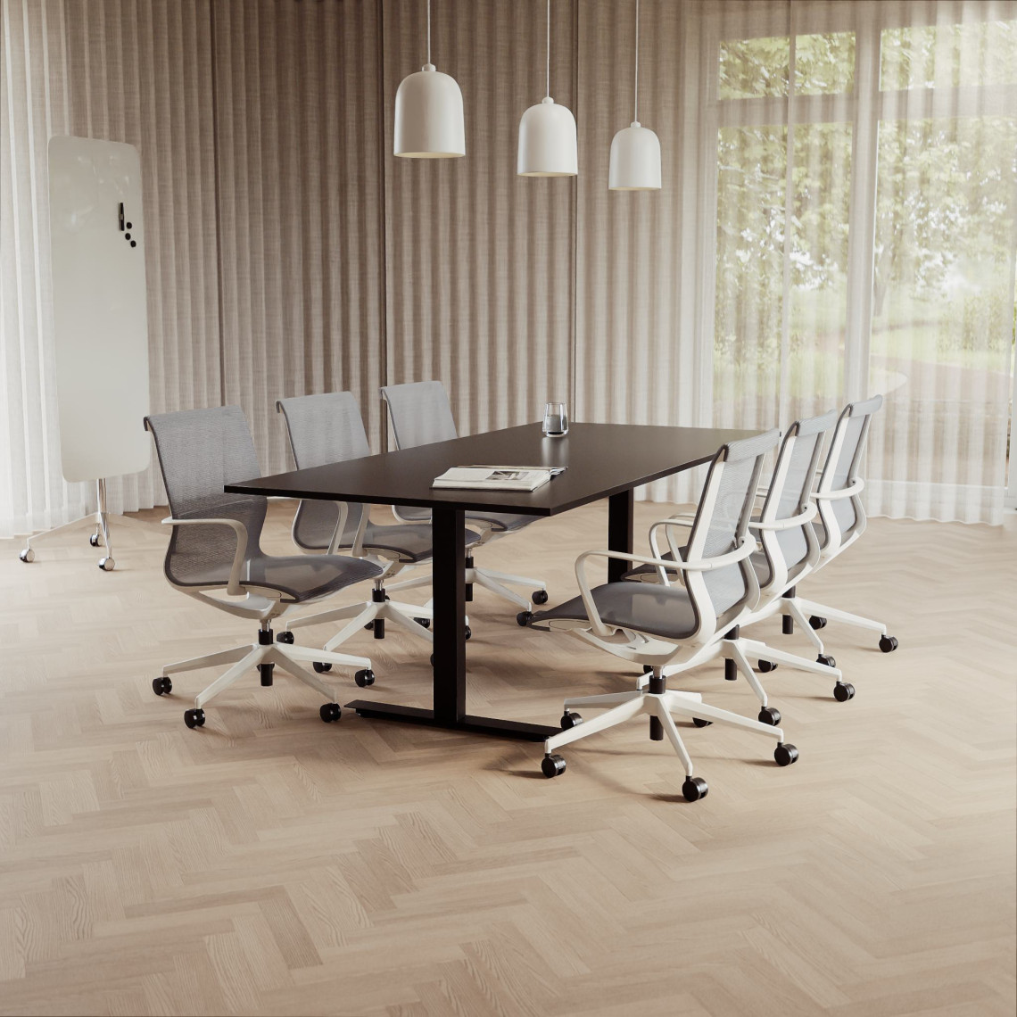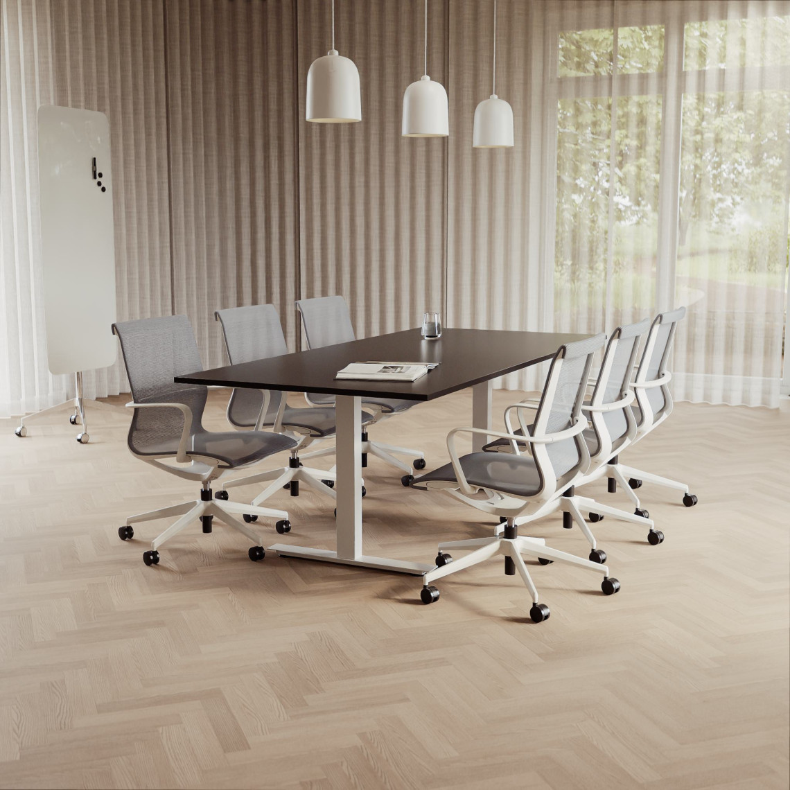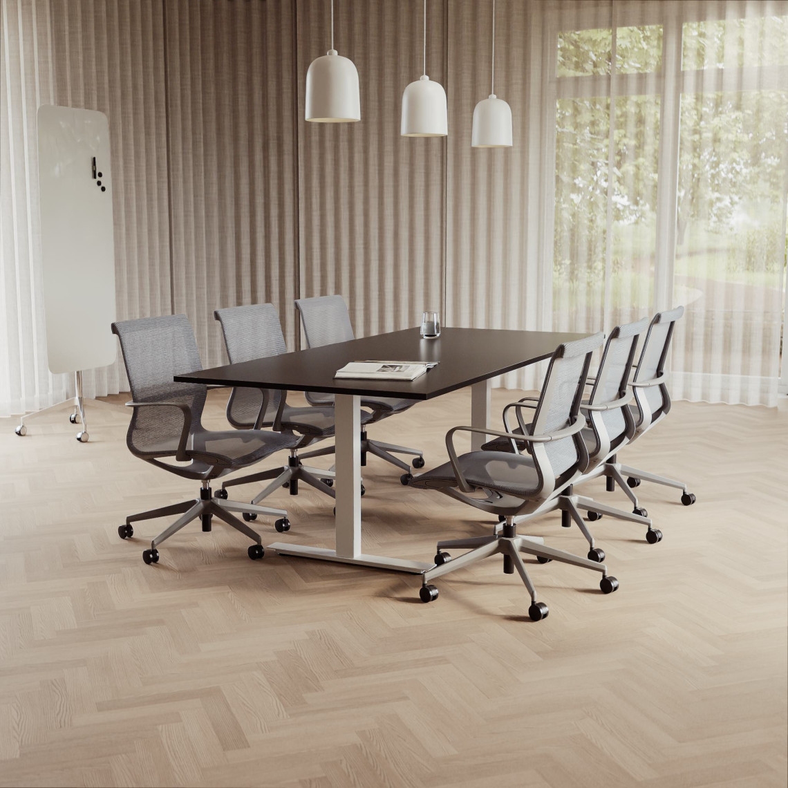Konferensgrupp Modul + Ergo 006C, Storlek 6 platser (220 cm), Bordsskiva Svart, Underrede Vit, Stol Ljusgrå