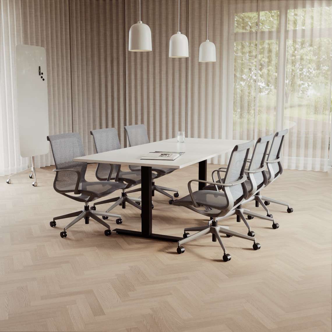 Konferensgrupp Modul + Ergo 285, Storlek 6 platser (220 cm), Bordsskiva Vit, Underrede Svart, Stol Grå