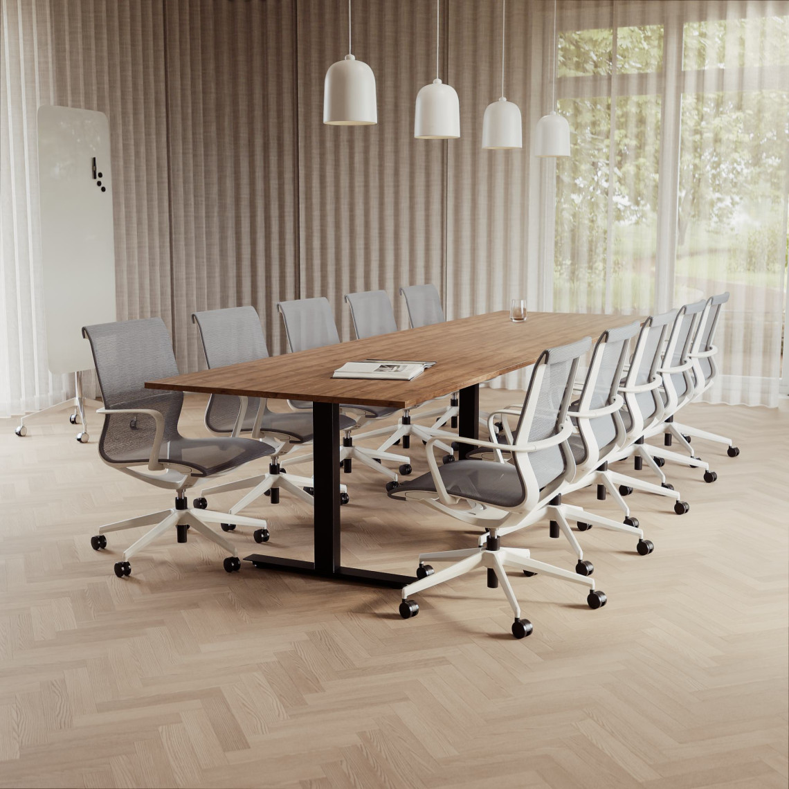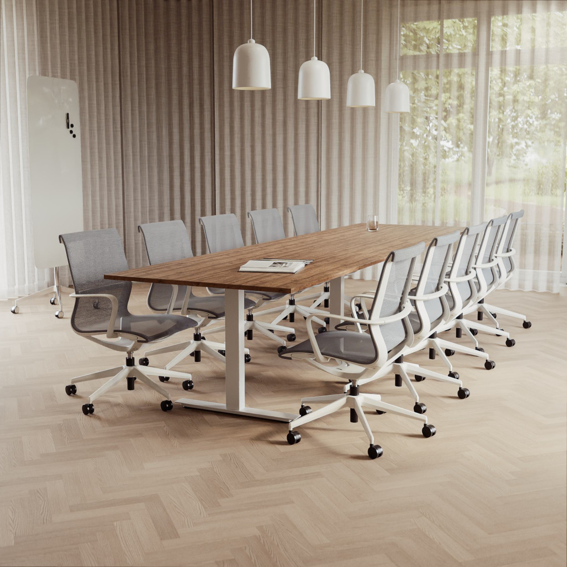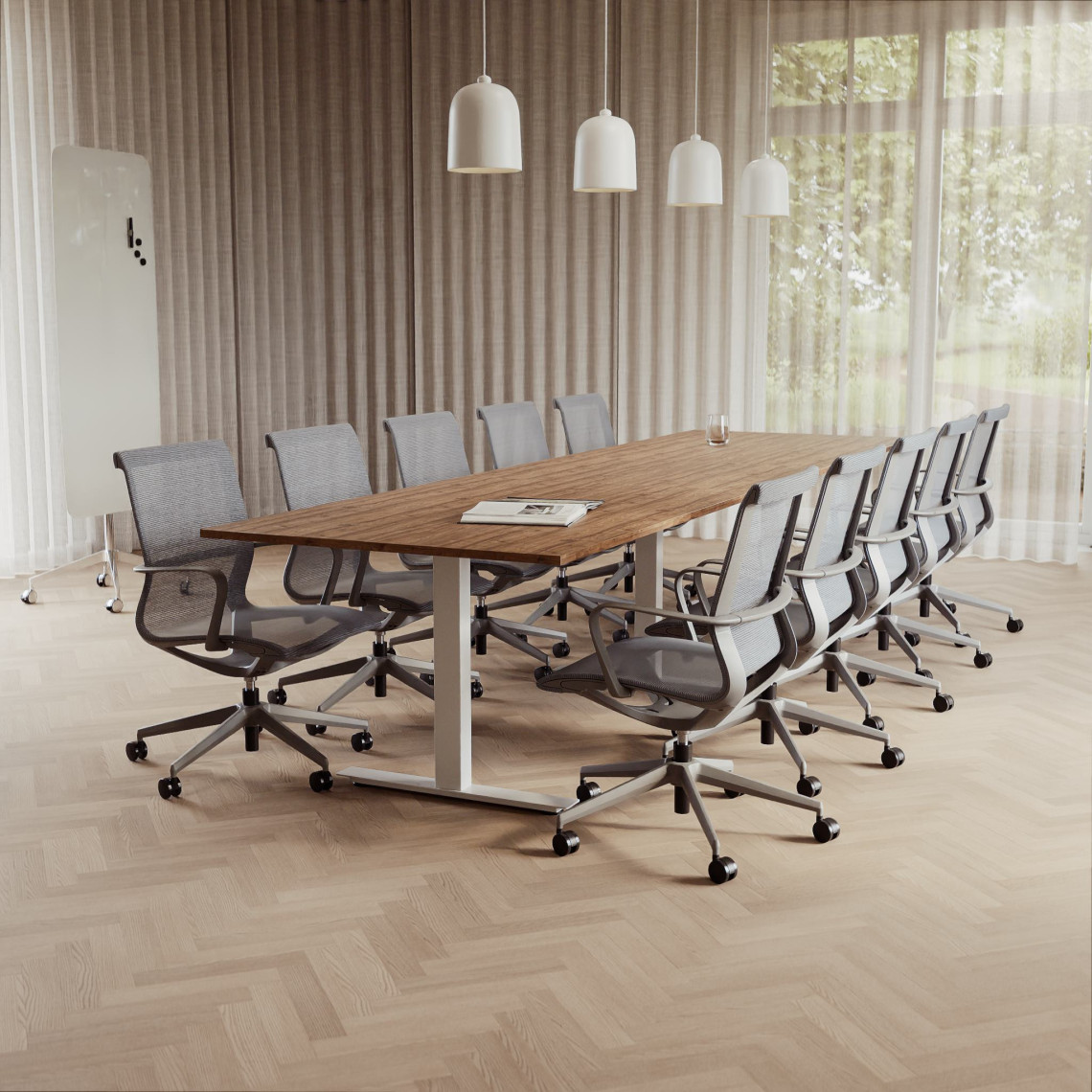Konferensgrupp Modul + Ergo 006C, Storlek 10 platser (360 cm), Bordsskiva Valnöt, Underrede Vit, Stol Ljusgrå
