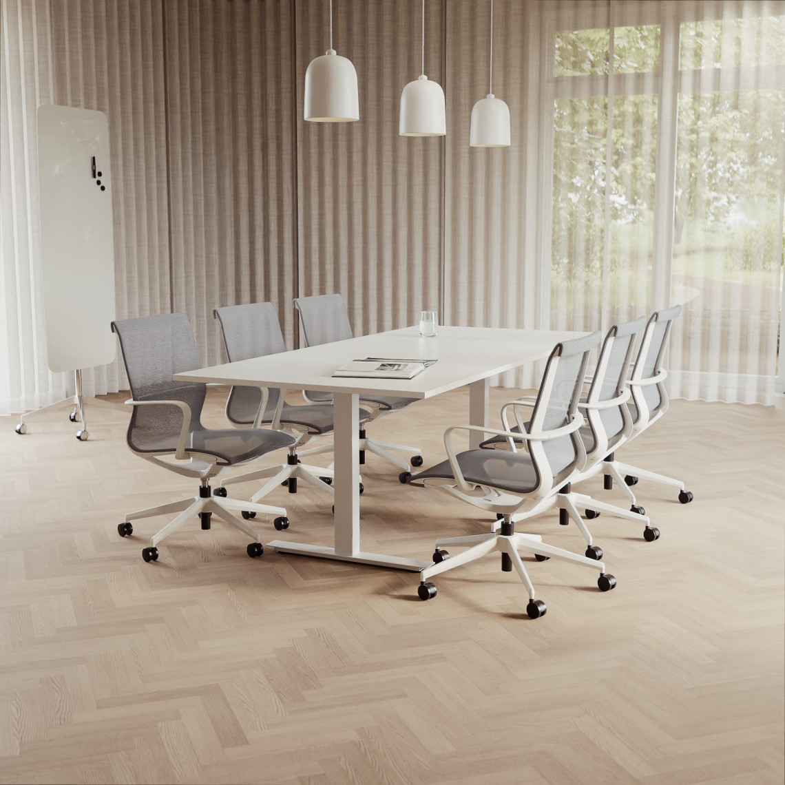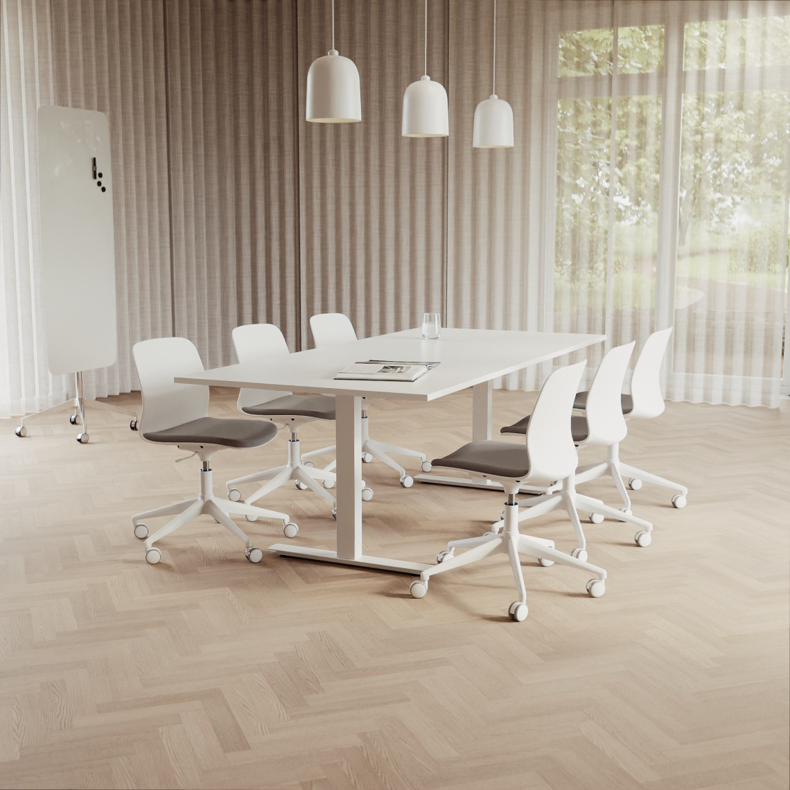 Konferensgrupp Modul + Ergo 006C, Storlek 6 platser (220 cm), Bordsskiva Vit, Underrede Vit, Stol Vit / Ljusgrå