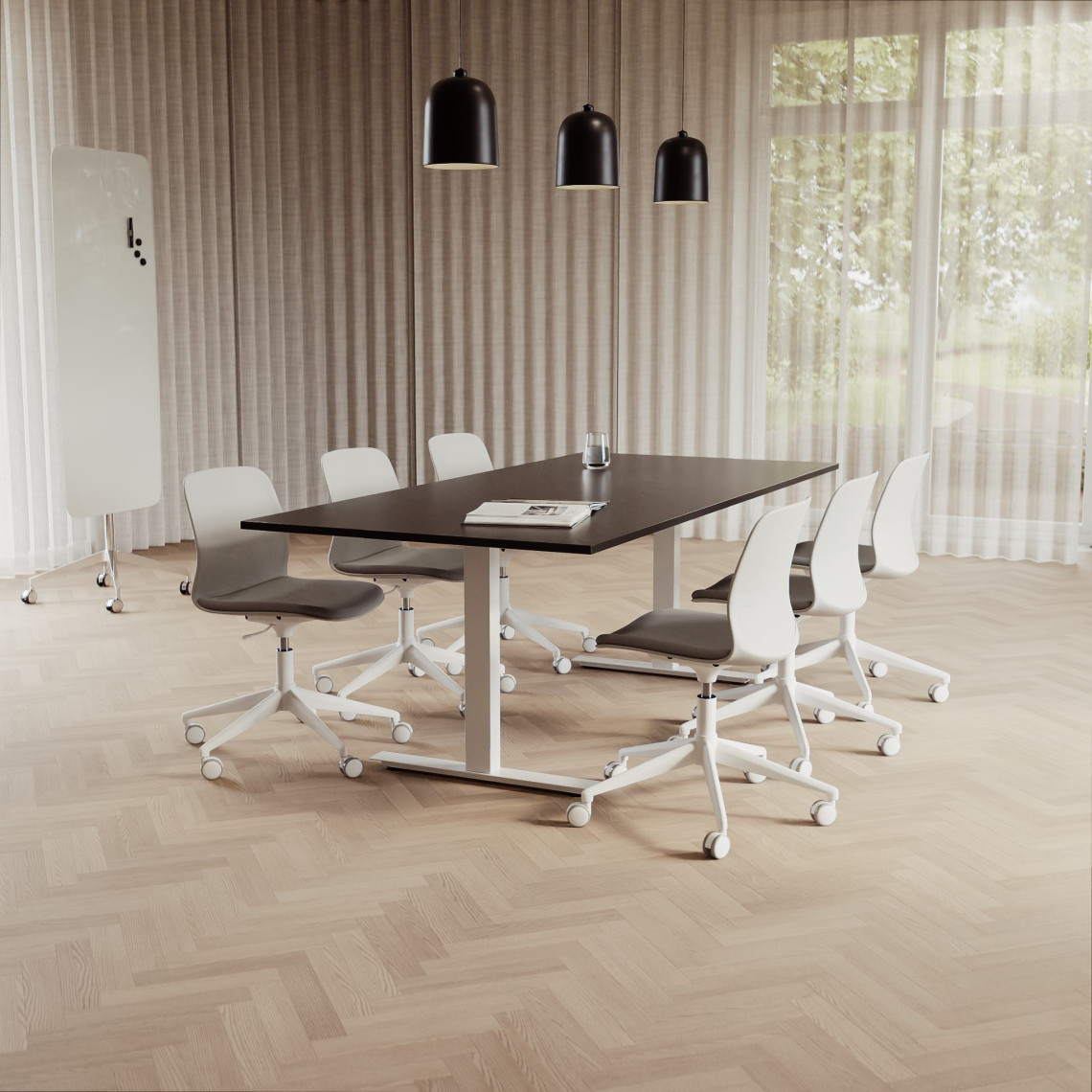Konferensgrupp Modul + Ergo 006C, Storlek 8 platser (280 cm), Bordsskiva Svart, Underrede Vit, Stol Ljusgrå