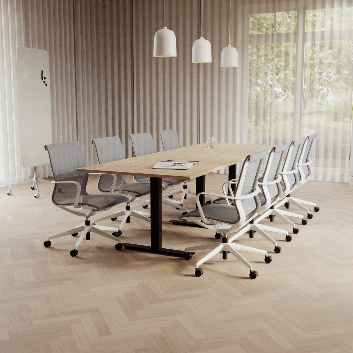Konferensgrupp Modul + Ergo 285, Storlek 10 platser (360 cm), Bordsskiva Ek, Underrede Vit, Stol Grå