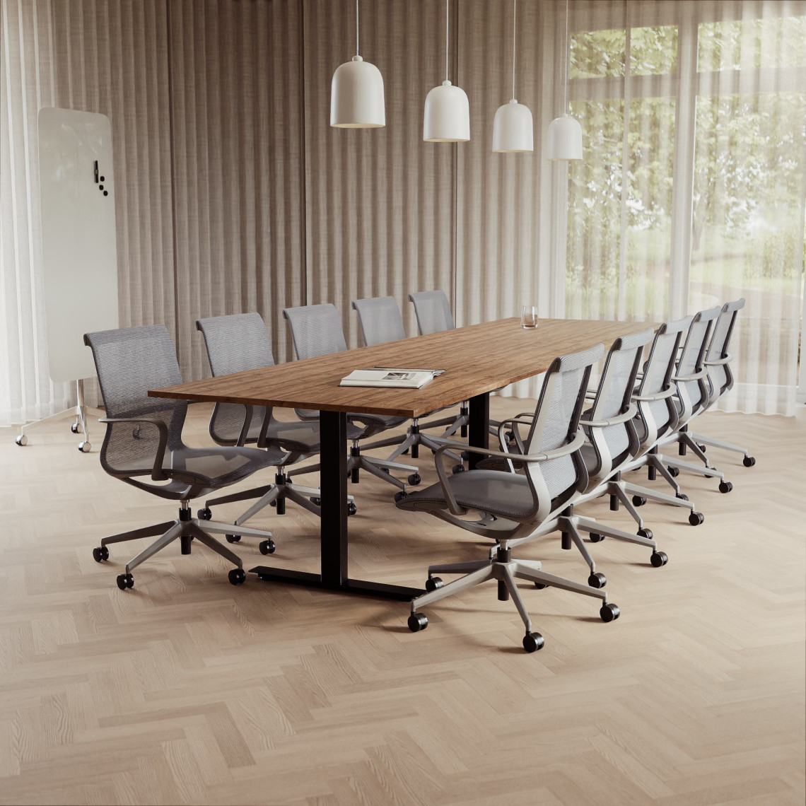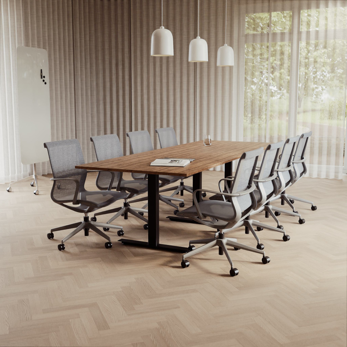 Konferensgrupp Modul + Ergo 285, Storlek 10 platser (360 cm), Bordsskiva Valnöt, Underrede Svart, Stol Grå