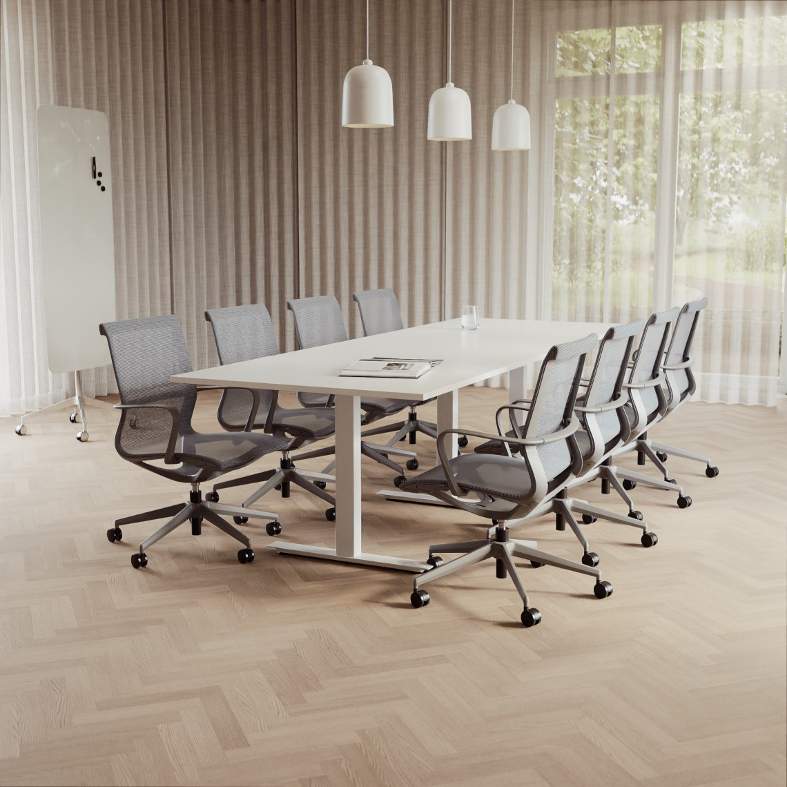 Konferensgrupp Modul + Ergo 006C, Storlek 8 platser (280 cm), Bordsskiva Vit, Underrede Vit, Stol Ljusgrå