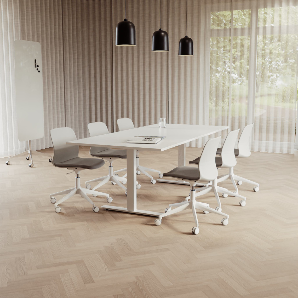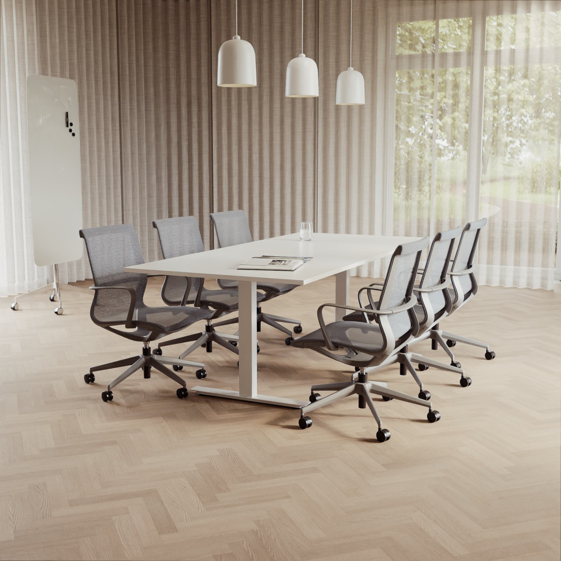 Konferensgrupp Modul + Ergo 285, Storlek 6 platser (220 cm), Bordsskiva Vit, Underrede Vit, Stol Grå