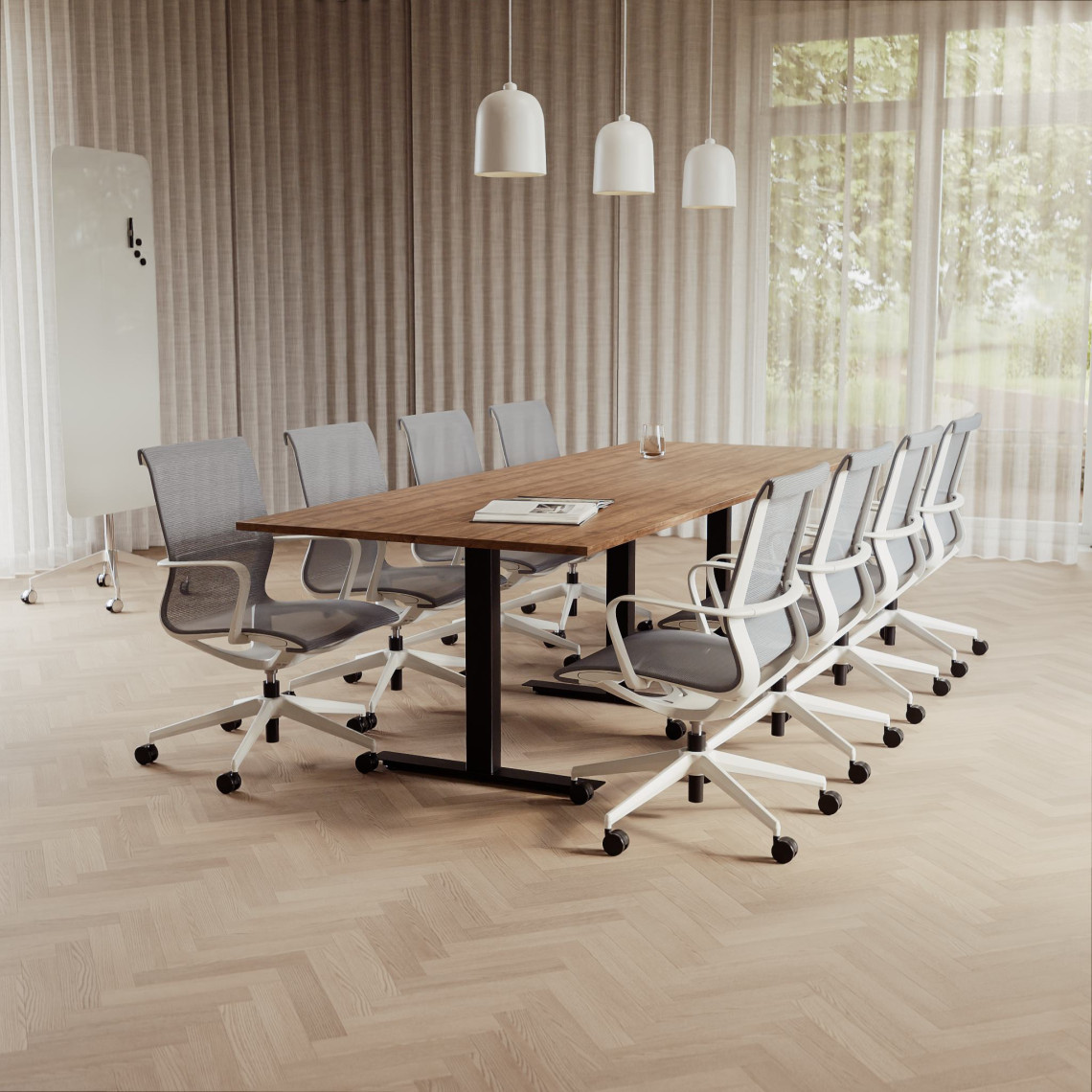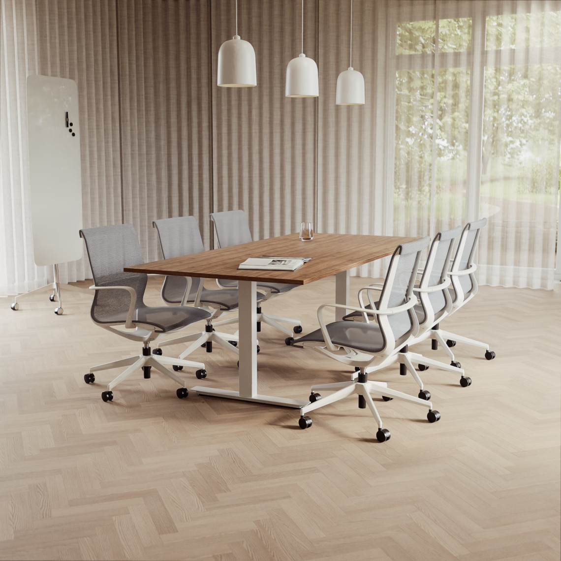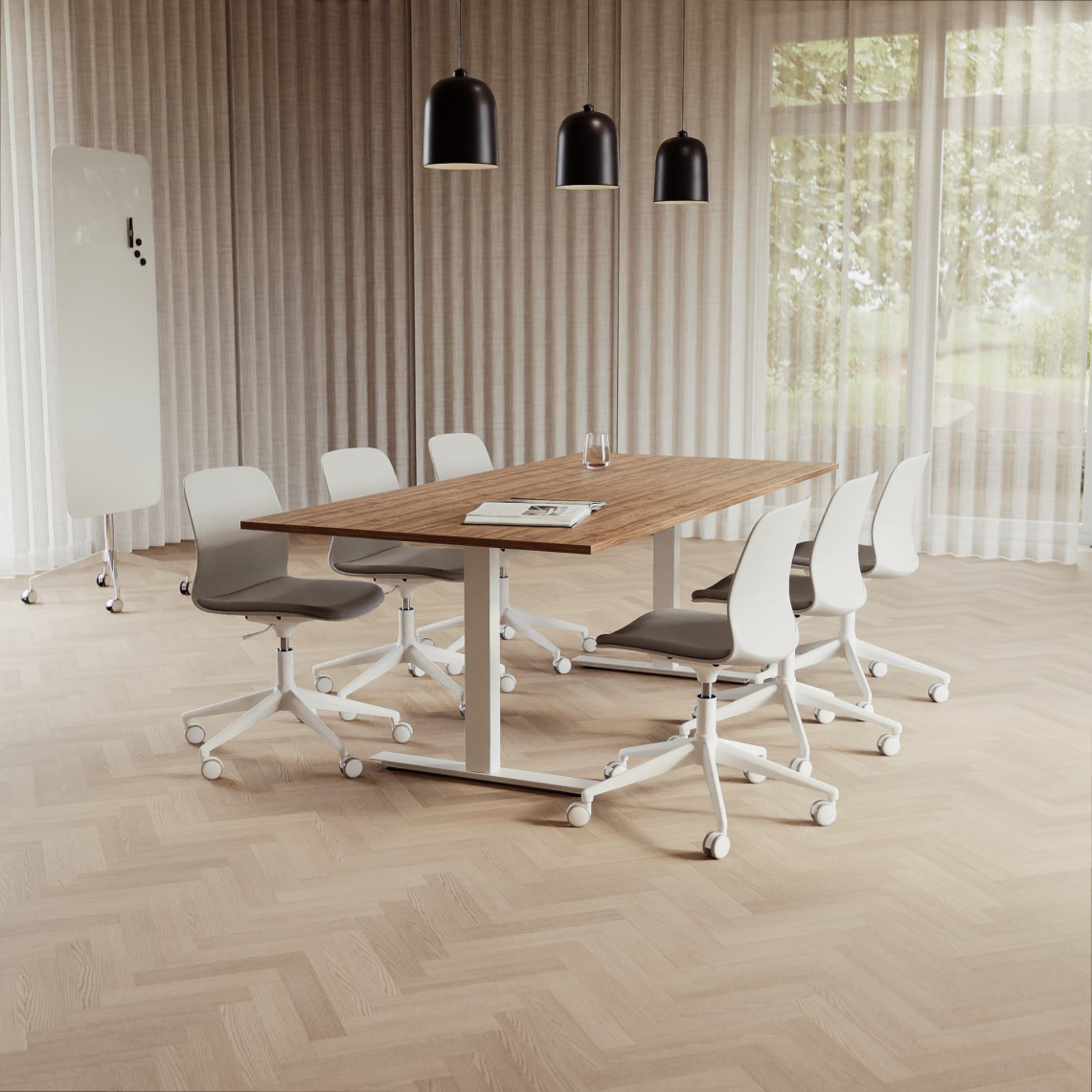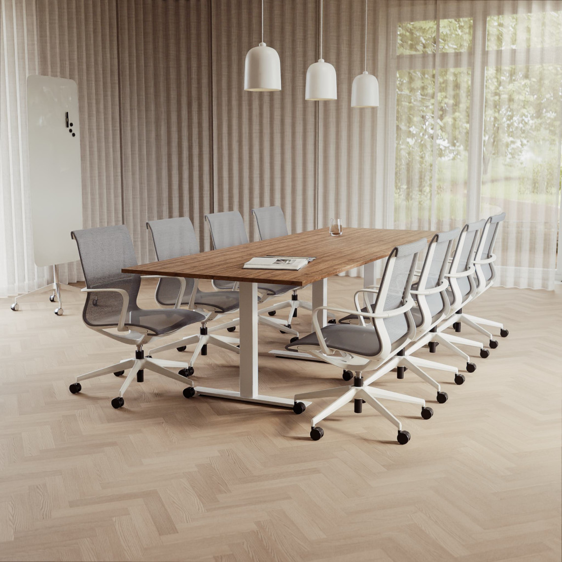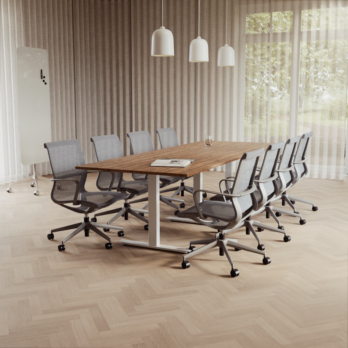 Konferensgrupp Modul + Ergo 006C, Storlek 8 platser (280 cm), Bordsskiva Valnöt, Underrede Vit, Stol Ljusgrå