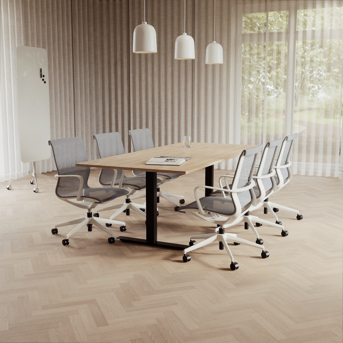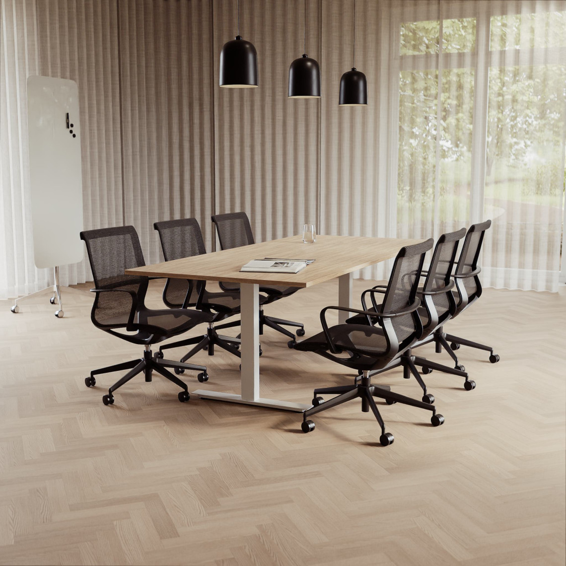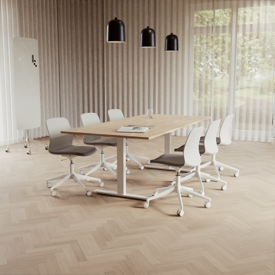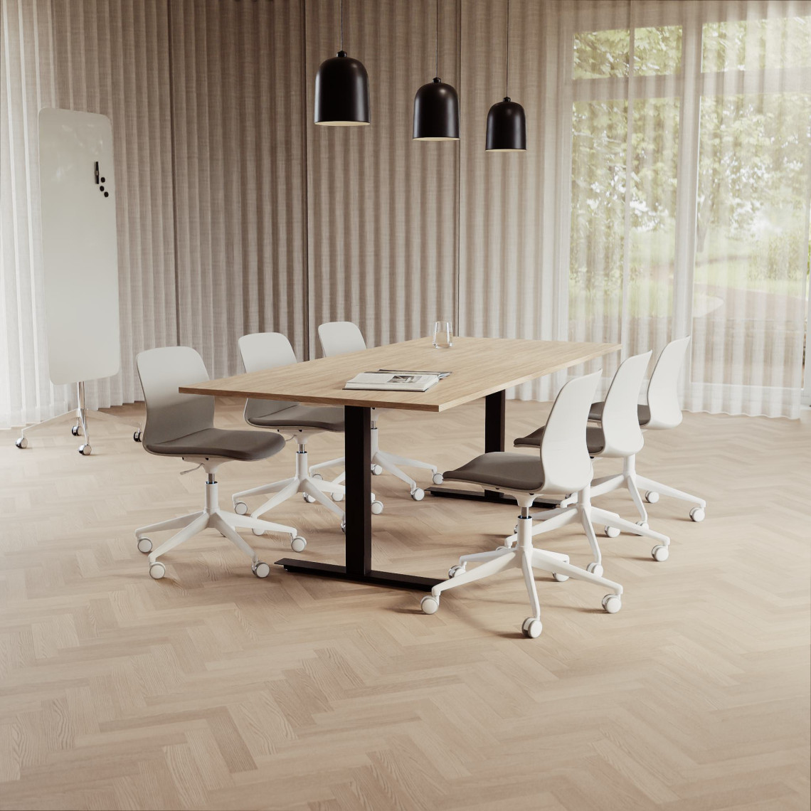 Konferensgrupp Modul + Ergo 285, Storlek 6 platser (220 cm), Bordsskiva Ek, Underrede Vit, Stol Svart