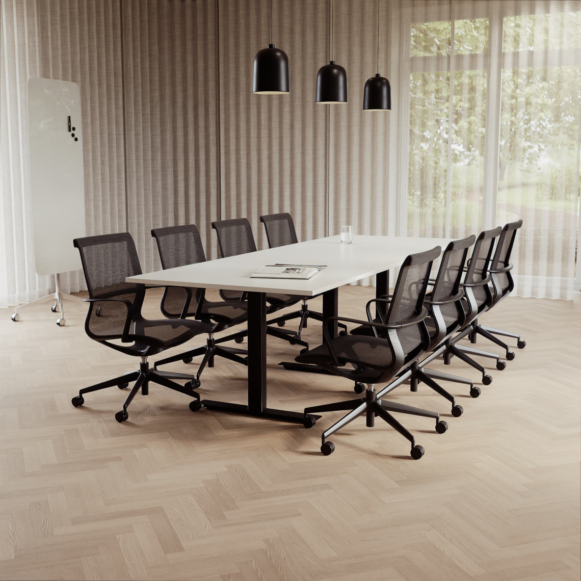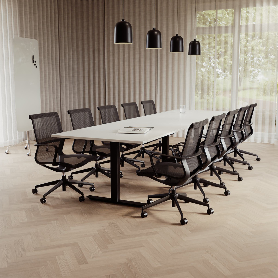 Konferensgrupp Modul + Ergo 285, Storlek 10 platser (360 cm), Bordsskiva Vit, Underrede Svart, Stol Svart