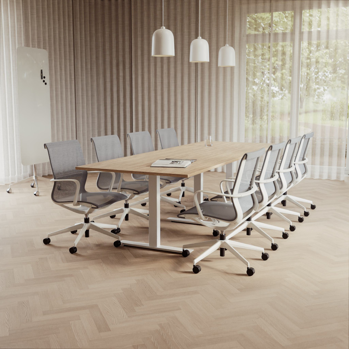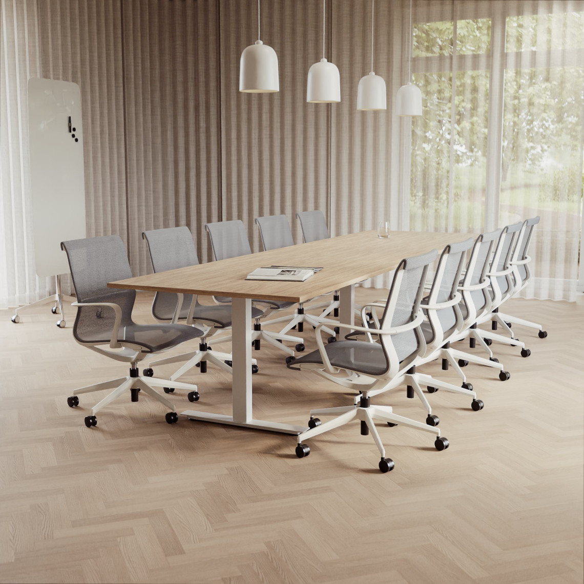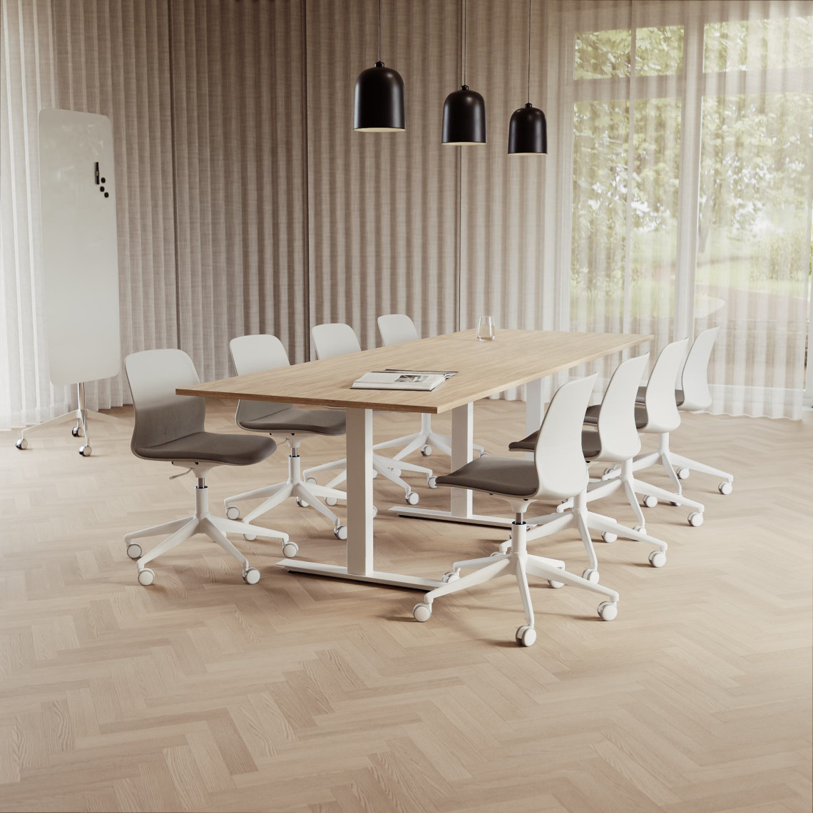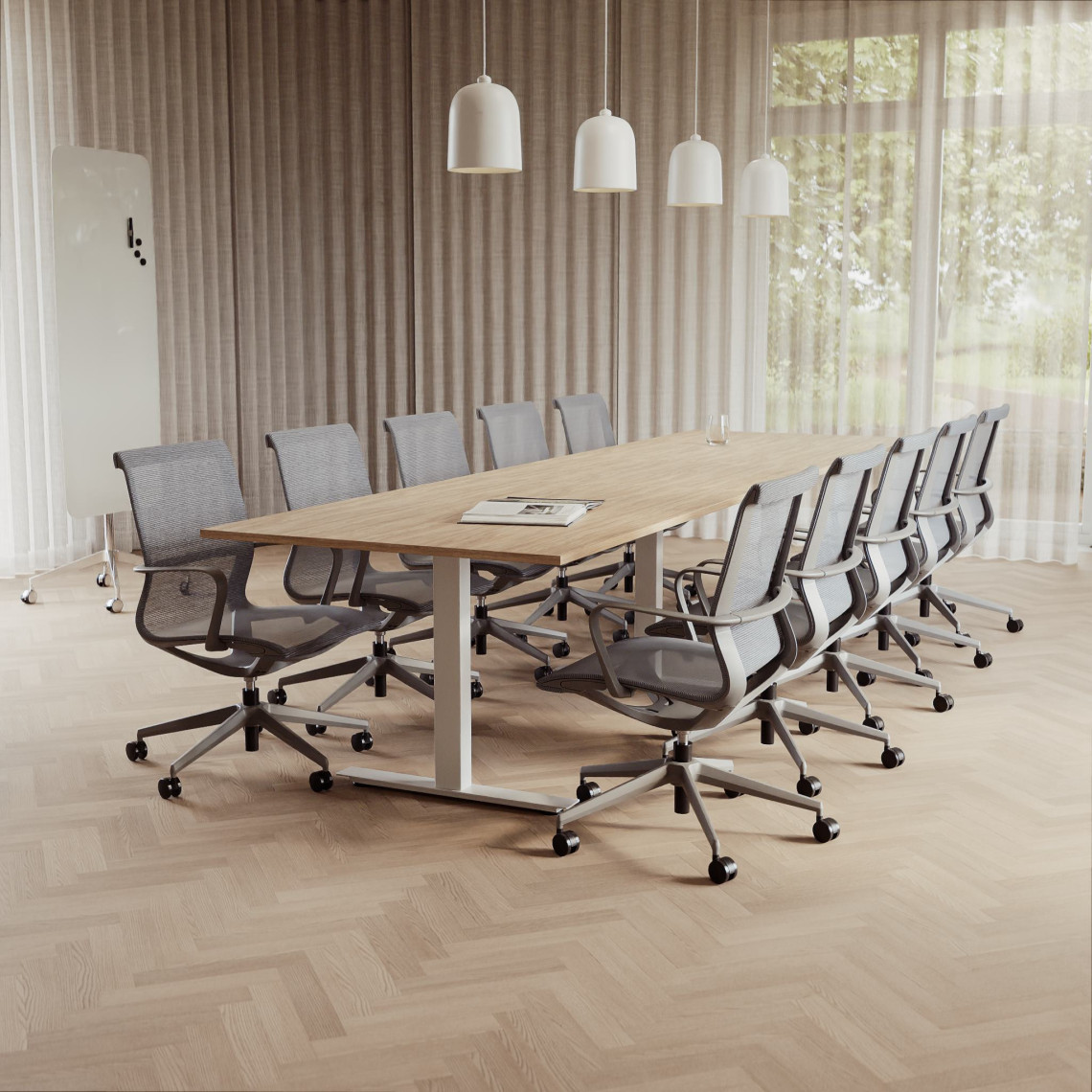 Konferensgrupp Modul + Ergo 006C, Storlek 10 platser (360 cm), Bordsskiva Ek, Underrede Vit, Stol Ljusgrå