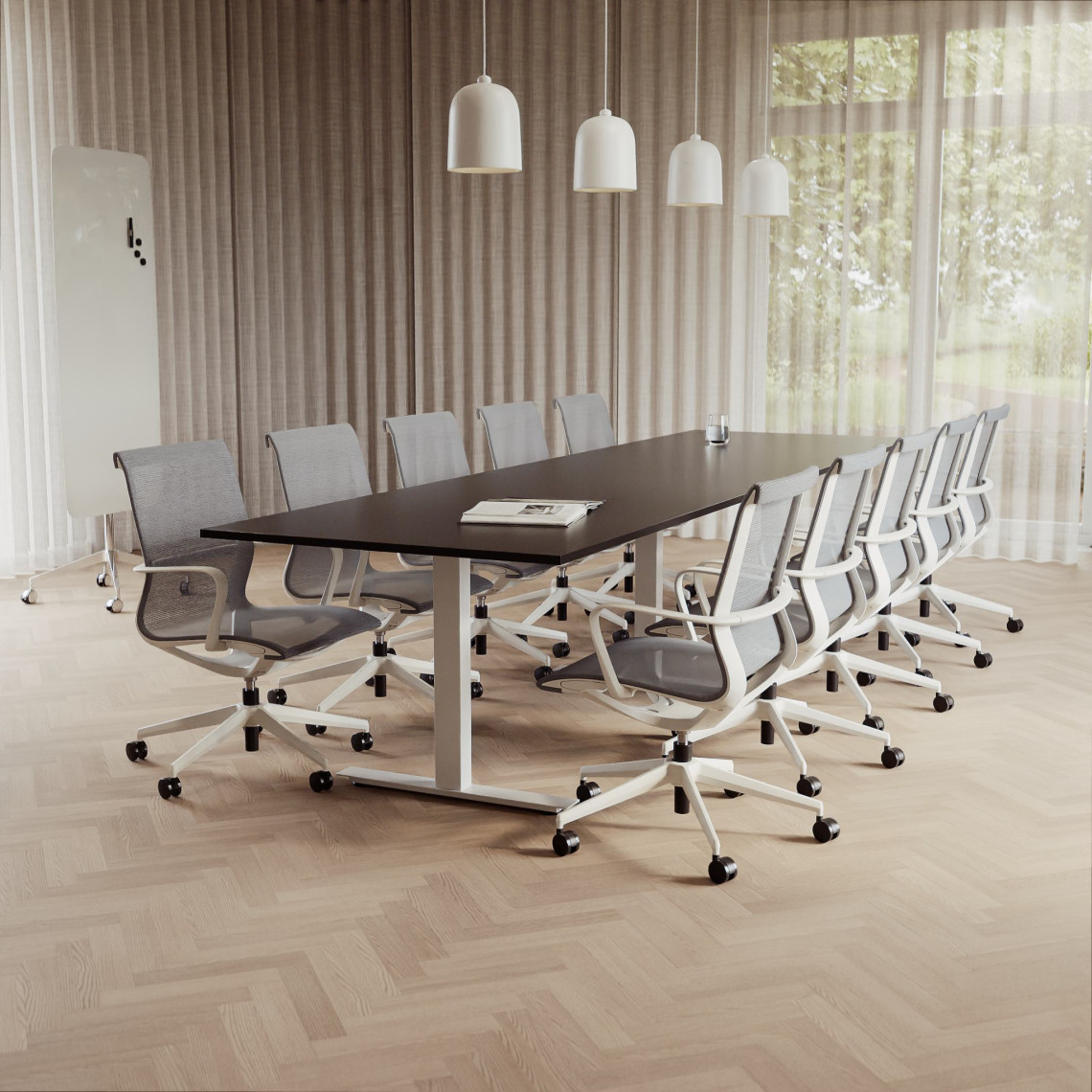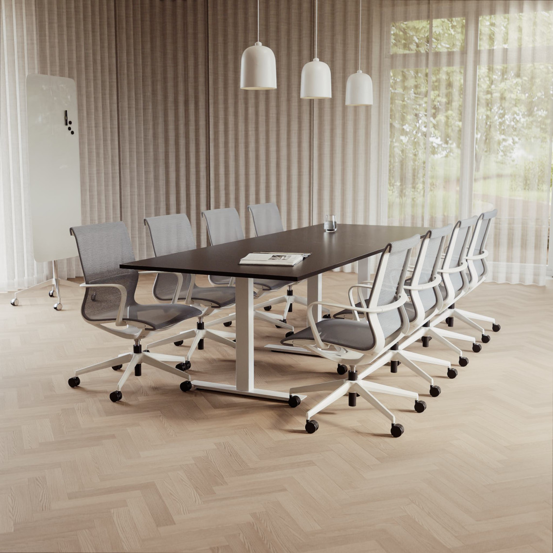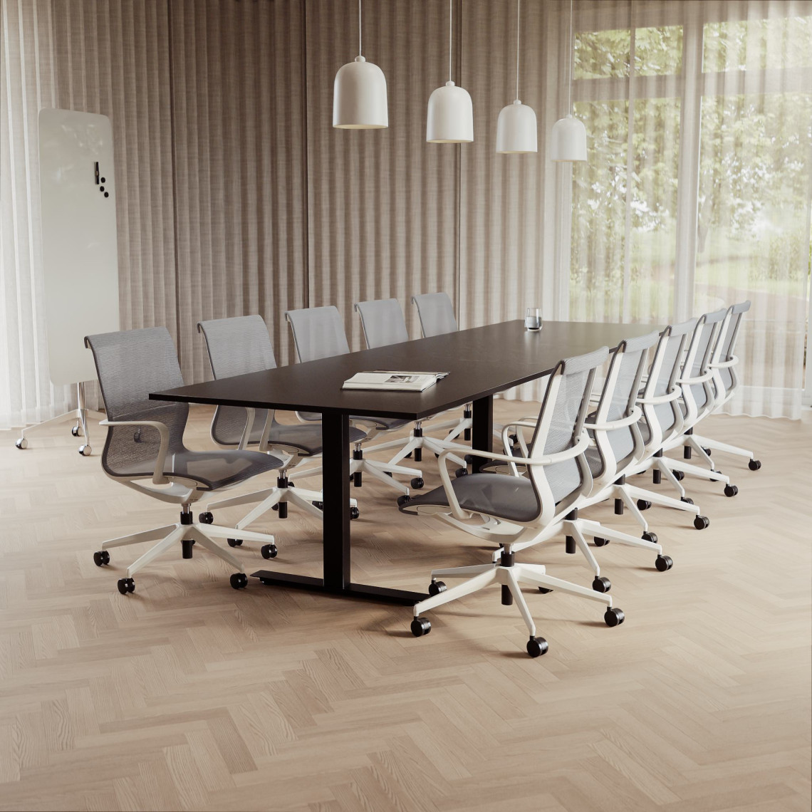 Konferensgrupp Modul + Ergo 285, Storlek 10 platser (360 cm), Bordsskiva Svart, Underrede Vit, Stol Grå