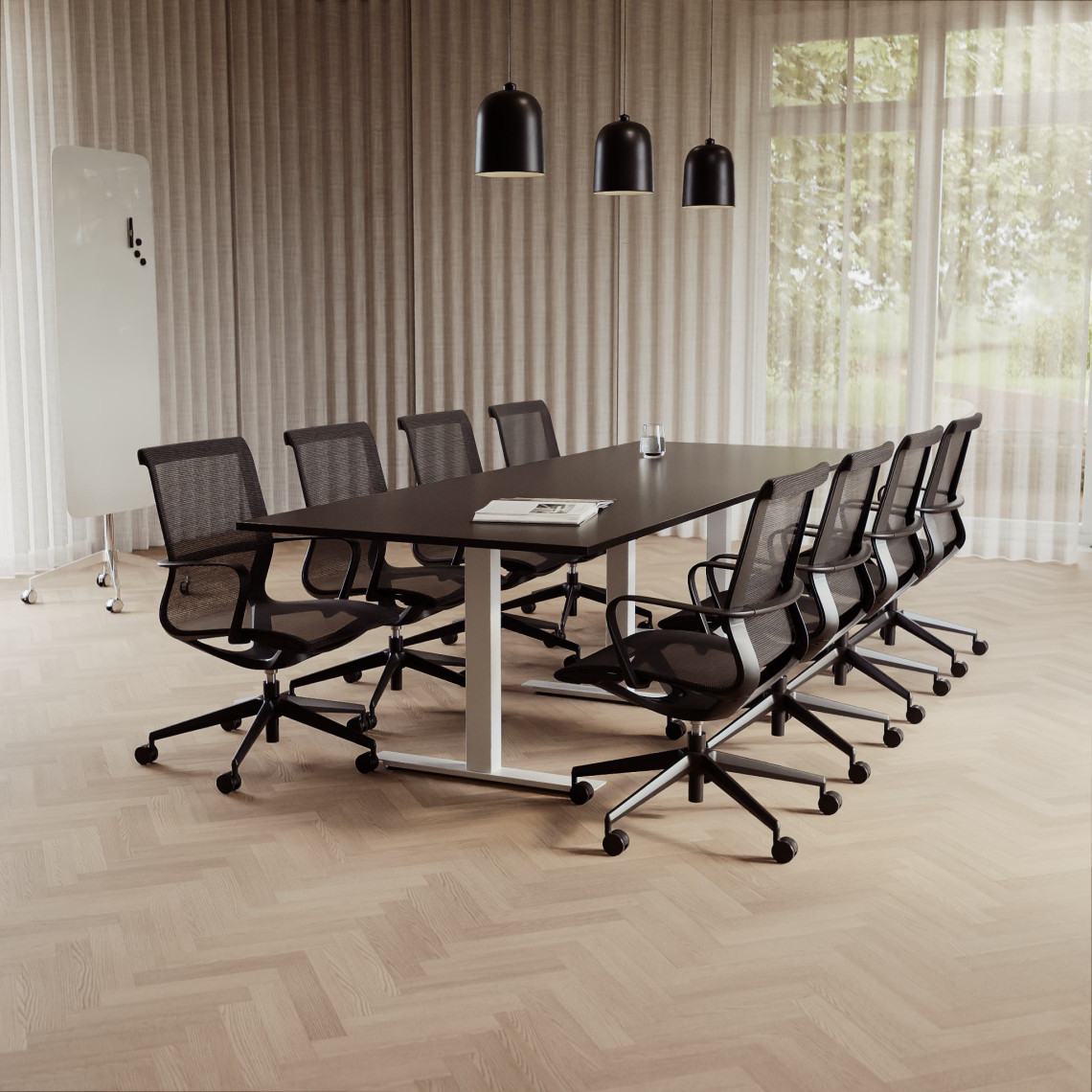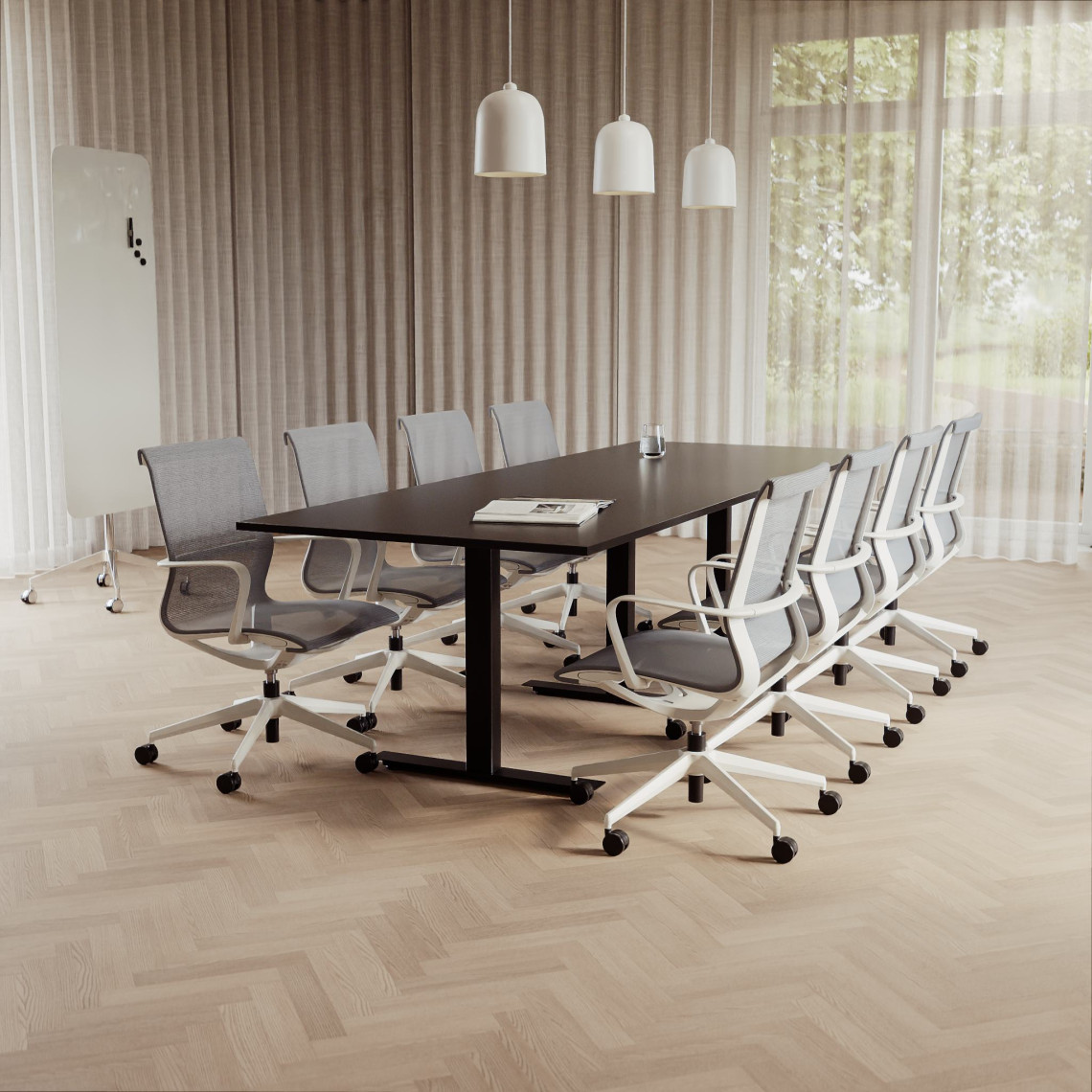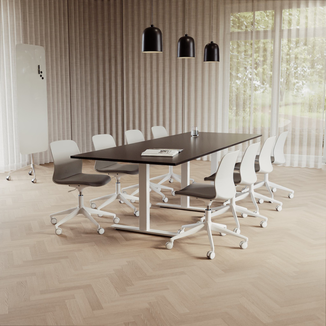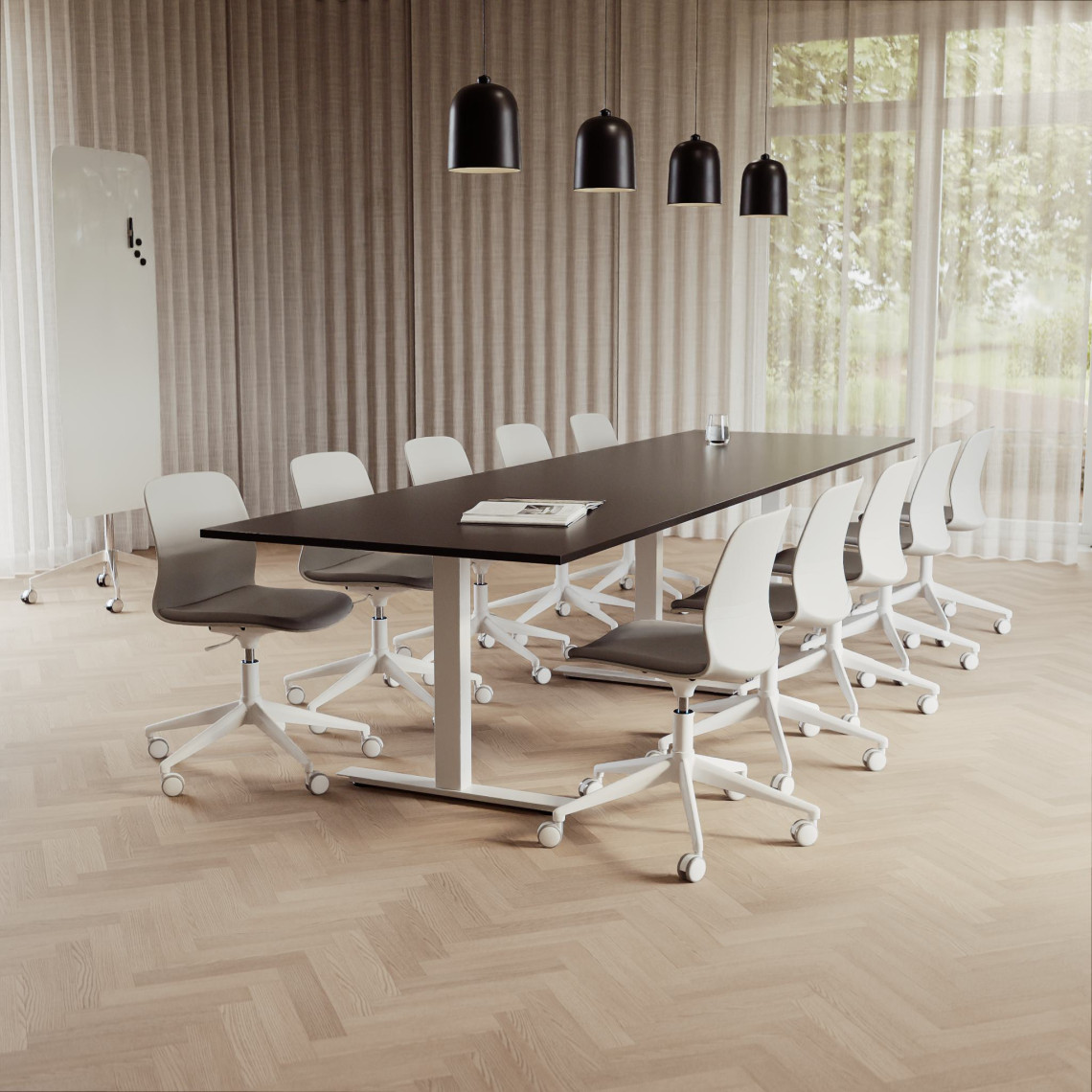 Konferensgrupp Modul + Ergo 285, Storlek 10 platser (360 cm), Bordsskiva Svart, Underrede Vit, Stol Svart