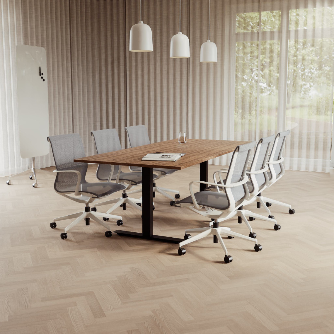 Konferensgrupp Modul + Ergo 285, Storlek 6 platser (220 cm), Bordsskiva Valnöt, Underrede Vit, Stol Svart