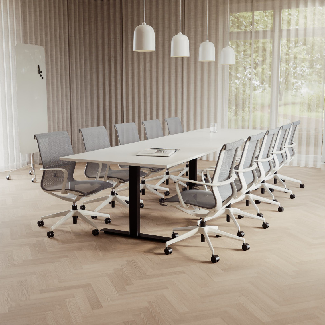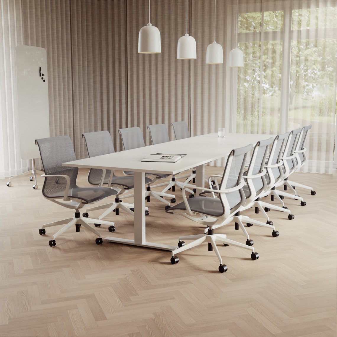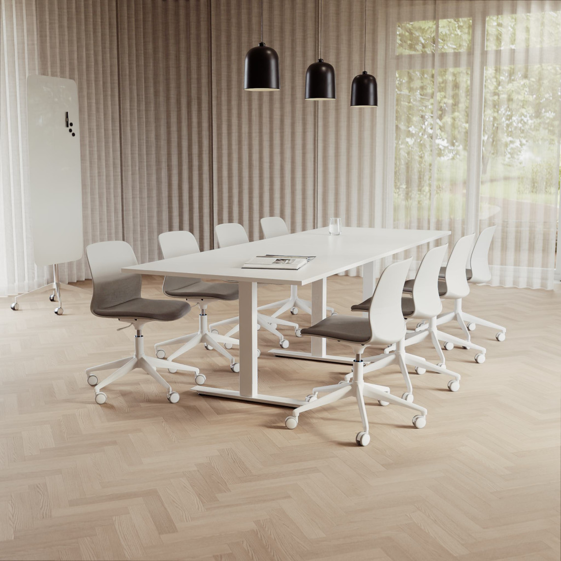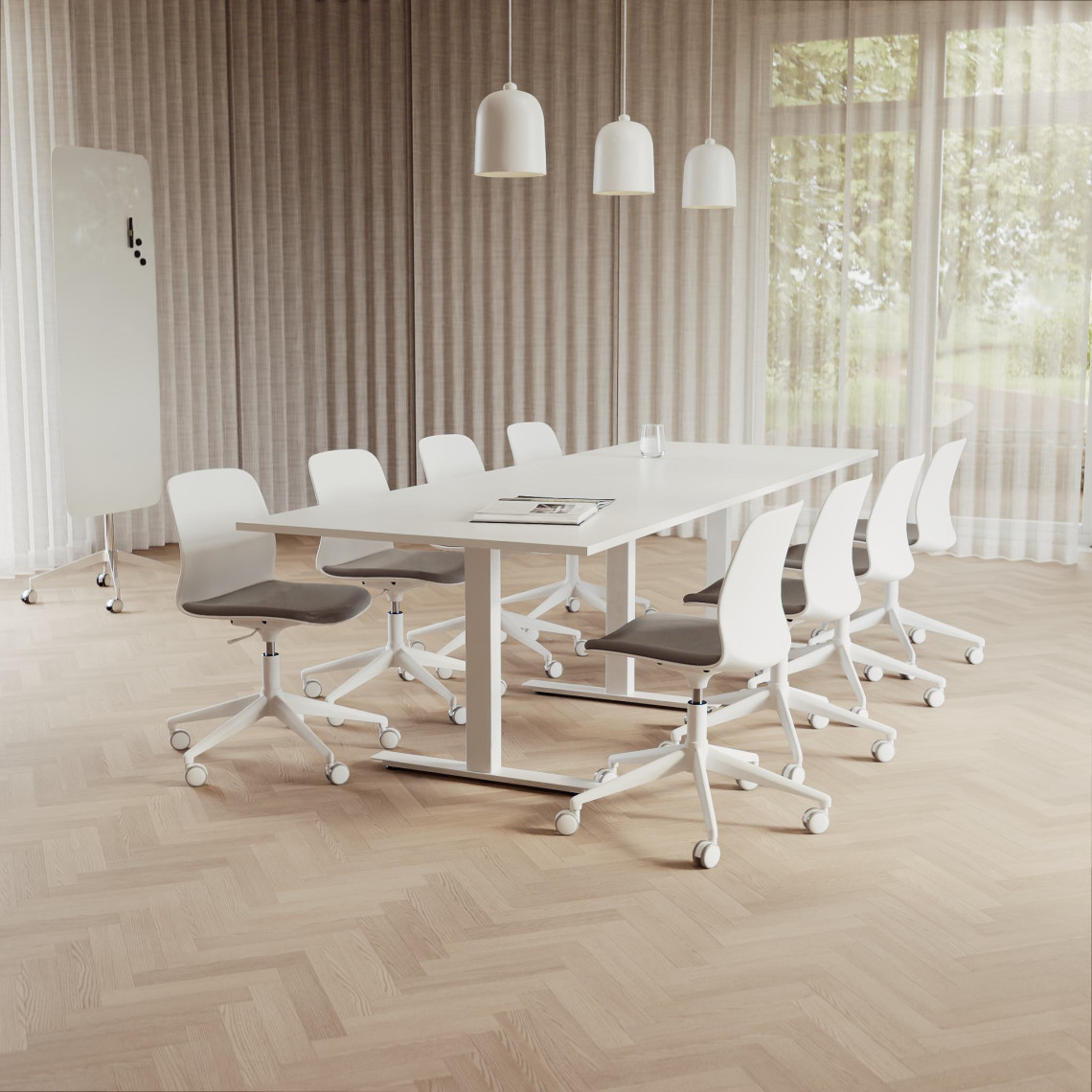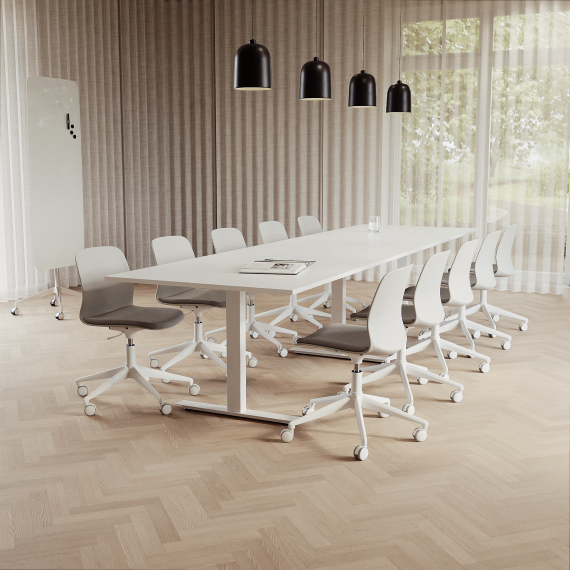 Konferensgrupp Modul + Ergo 285, Storlek 10 platser (360 cm), Bordsskiva Vit, Underrede Vit, Stol Grå