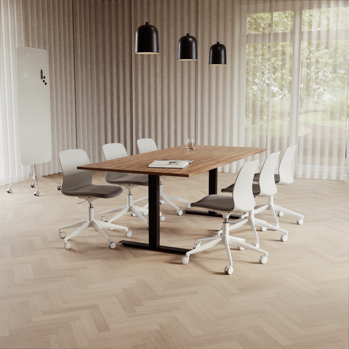 Konferensgrupp Modul + Ergo 285, Storlek 8 platser (280 cm), Bordsskiva Valnöt, Underrede Vit, Stol Svart