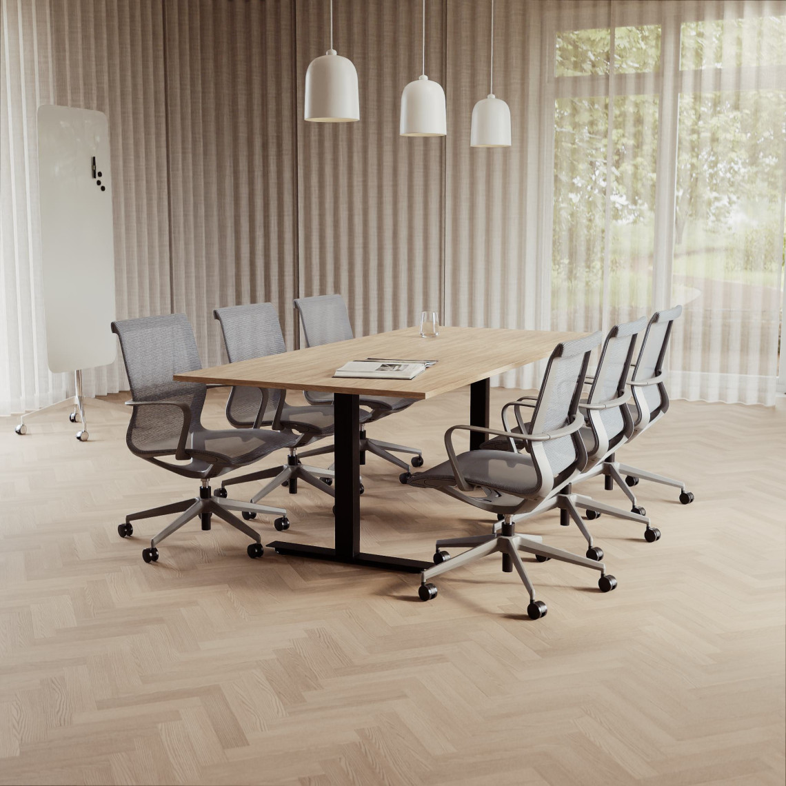 Konferensgrupp Modul + Ergo 285, Storlek 6 platser (220 cm), Bordsskiva Ek, Underrede Svart, Stol Grå