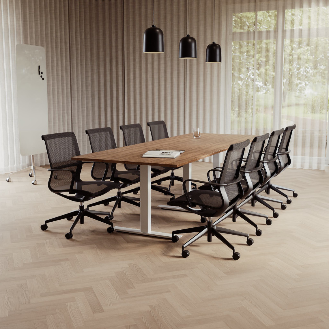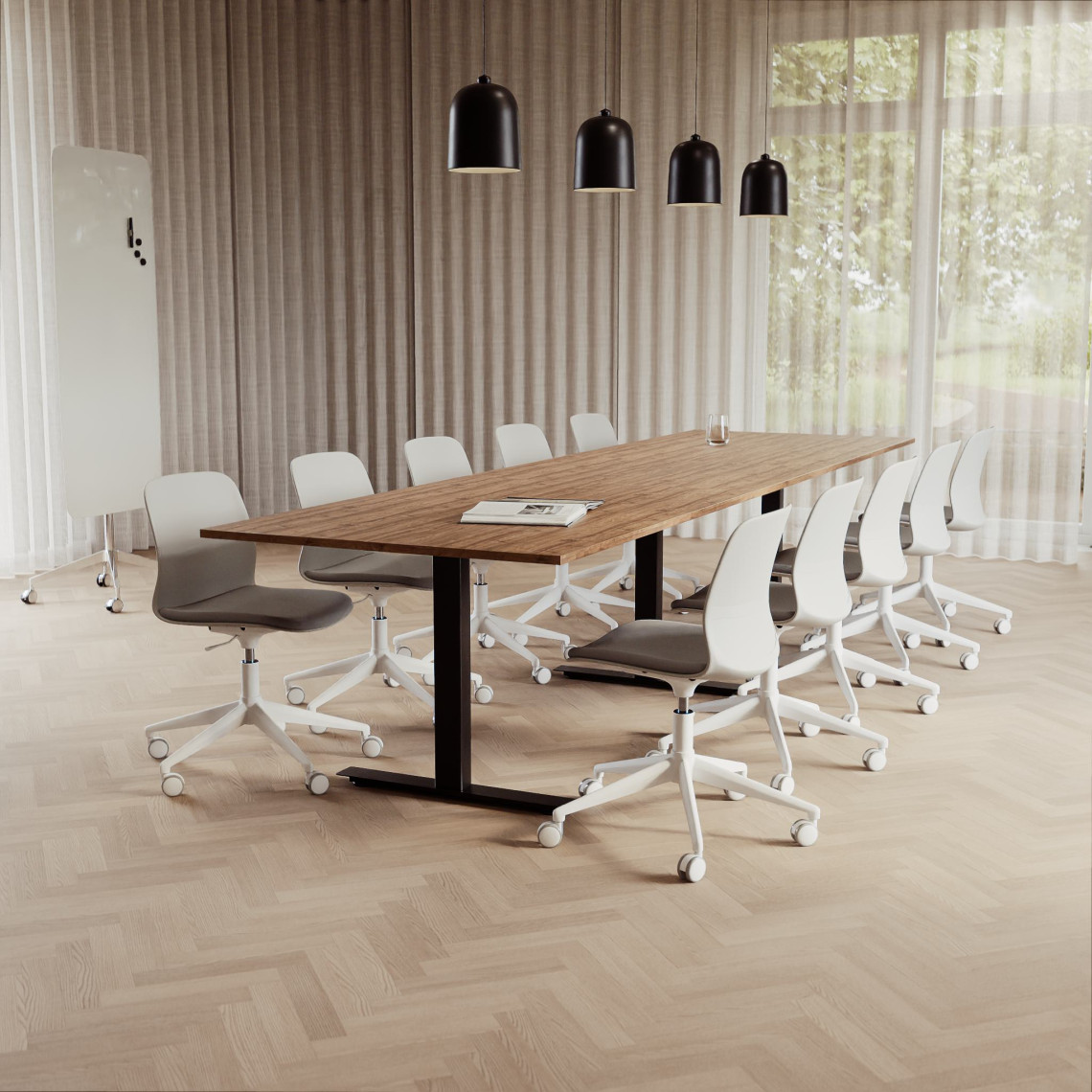 Konferensgrupp Modul + Ergo 285, Storlek 10 platser (360 cm), Bordsskiva Valnöt, Underrede Vit, Stol Svart