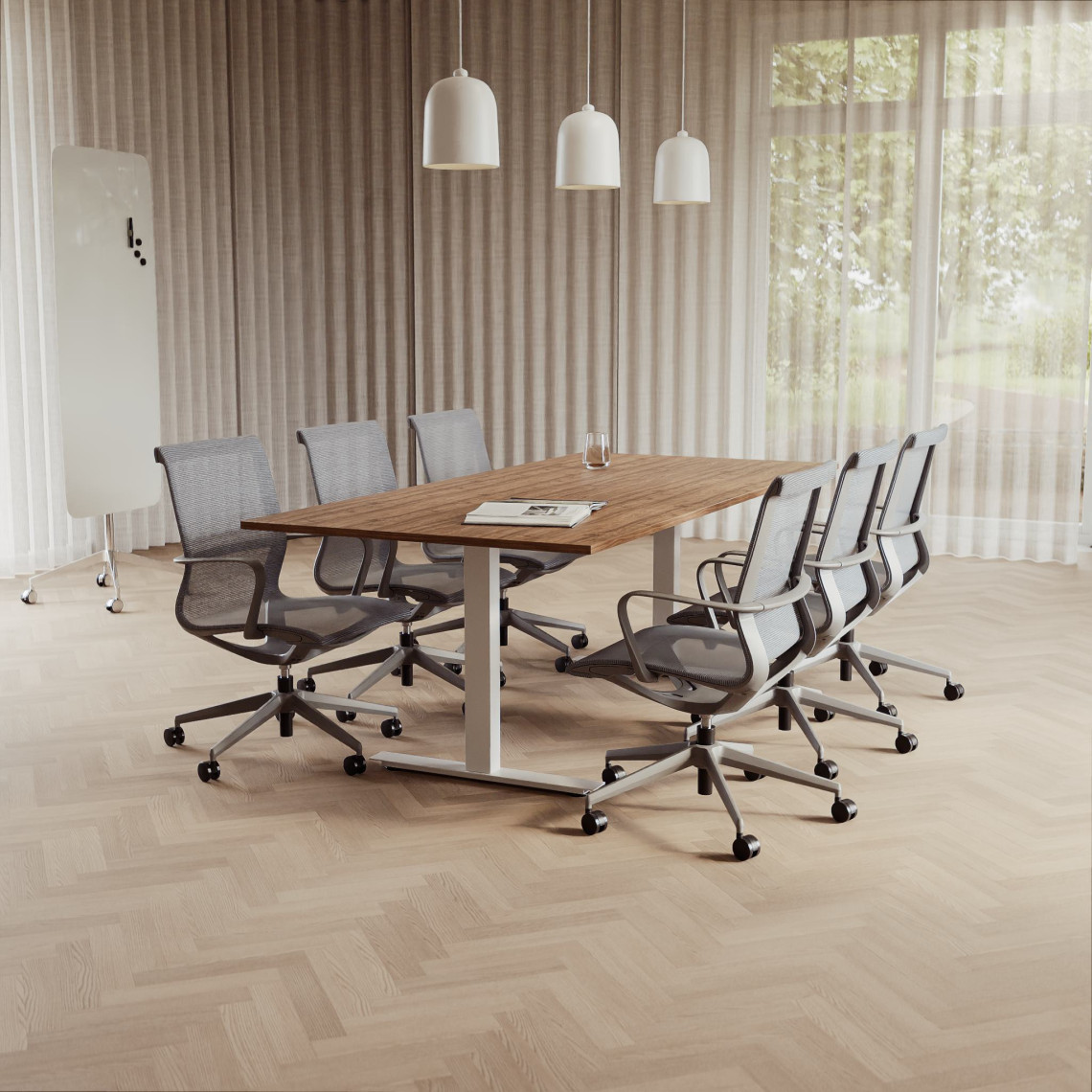Konferensgrupp Modul + Ergo 006C, Storlek 6 platser (220 cm), Bordsskiva Valnöt, Underrede Vit, Stol Ljusgrå