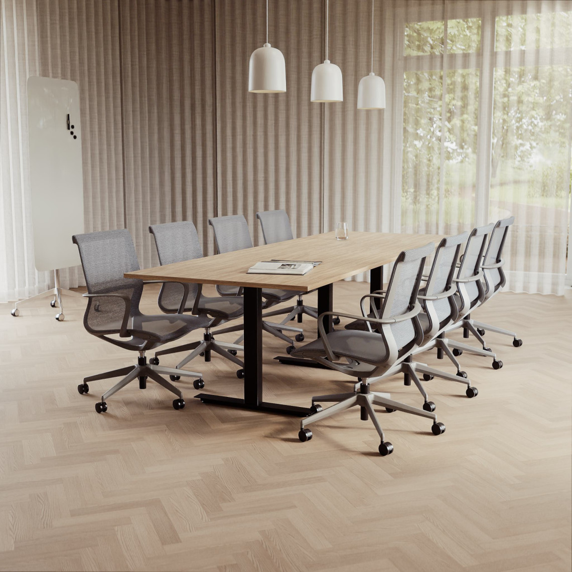 Konferensgrupp Modul + Ergo 285, Storlek 10 platser (360 cm), Bordsskiva Ek, Underrede Svart, Stol Grå