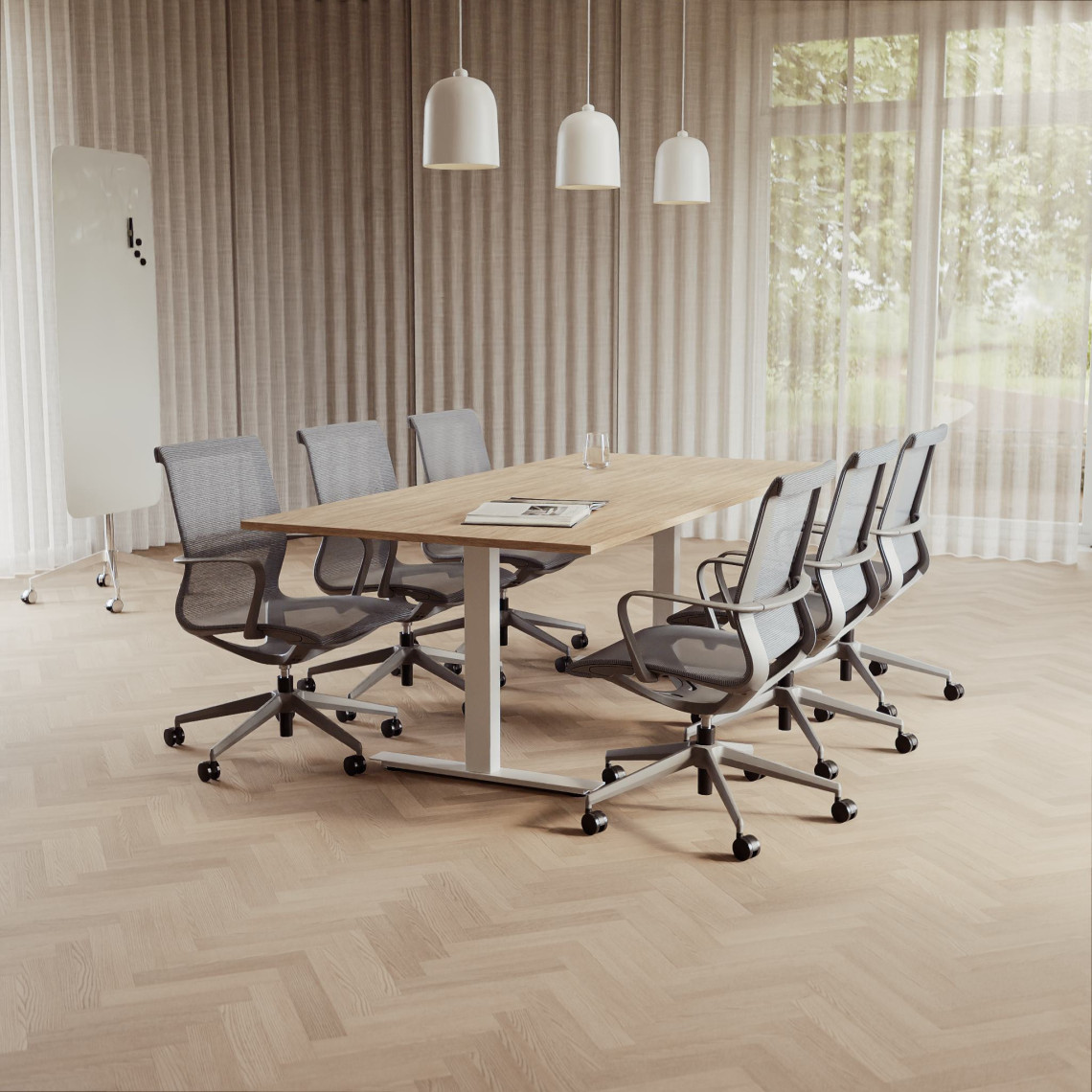 Konferensgrupp Modul + Ergo 285, Storlek 6 platser (220 cm), Bordsskiva Ek, Underrede Vit, Stol Grå