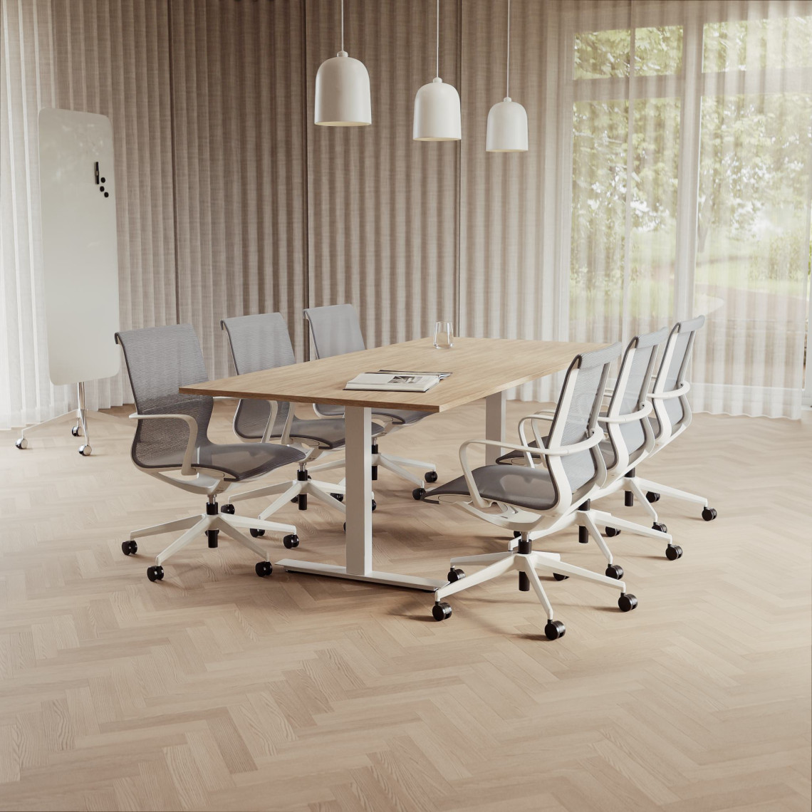 Konferensgrupp Modul + Ergo 006C, Storlek 6 platser (220 cm), Bordsskiva Ek, Underrede Vit, Stol Ljusgrå
