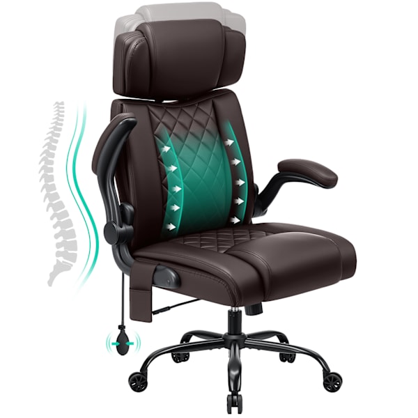 HOFFREE Ergonomisk kontorsstol, 200 kg kapacitet, Executive-fåtölj, PU-läder, högt ryggstöd, justerbart nackstöd, fällbara armstöd, datorstol, brun
