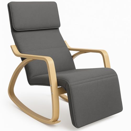 BAKAJI Björkträ gungstol med bomullsöverdrag i hög densitet, avkopplande svängande fåtölj med justerbar fotstöd och kudde, ergonomisk sits (grå)